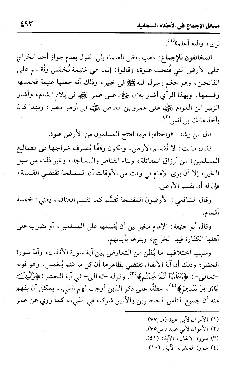 • المخالفون للإجماع: ذهب بعض العلماء إلى القول بعدم جواز أخذ الخراج على الأرض التي فُتحت عنوة، وقالوا: إنما هي غنيمة تُخمَّس وتُقسم على الفاتحين، وهو حكم رسول اللَّه -صلى اللَّه عليه وسلم- في خبير، وذلك أنه جعلها غنيمة فخمسها وقسمها، وبهذا الرأي أشار بلال -رضي اللَّه عنه- على عمر -رضي اللَّه عنه- في بلاد الشام، وأشار الزبير ابن العوام -رضي اللَّه عنه- على عمرو بن العاص -رضي اللَّه عنه- في أرض مصر، وبهذا كان يأخذ مالك بن أنس (¬2).