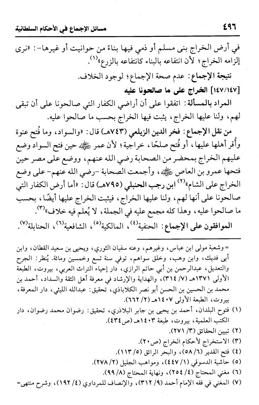 • من نقل الإجماع: فخر الدين الزيلعي (743 هـ) قال: "والسواد، وما فُتح عنوة وأُقر أهلها عليها، أو فُتح صلحًا، خراجية؛ لأن عمر -رضي اللَّه عنه- حين فتح السواد وضع عليهم الخراج بمحضر من الصحابة رضي اللَّه عنهم، ووضع على مصر حين فتحها عمرو بن العاص -رضي اللَّه عنه-، وأجمعت الصحابة -رضي اللَّه عنهم- على وضع الخراج على الشام" (¬2) ابن رجب الحنبلي (795 هـ) قال: "أما أرض الكفار التي صالحونا على أنها لهم، ولنا عليها الخراج، فيثبت الخراج عليها أيضًا، بحسب ما صالحوا عليه، وهذا كله مجمع عليه في الجملة، لا يُعلم فيه خلاف" (¬3).