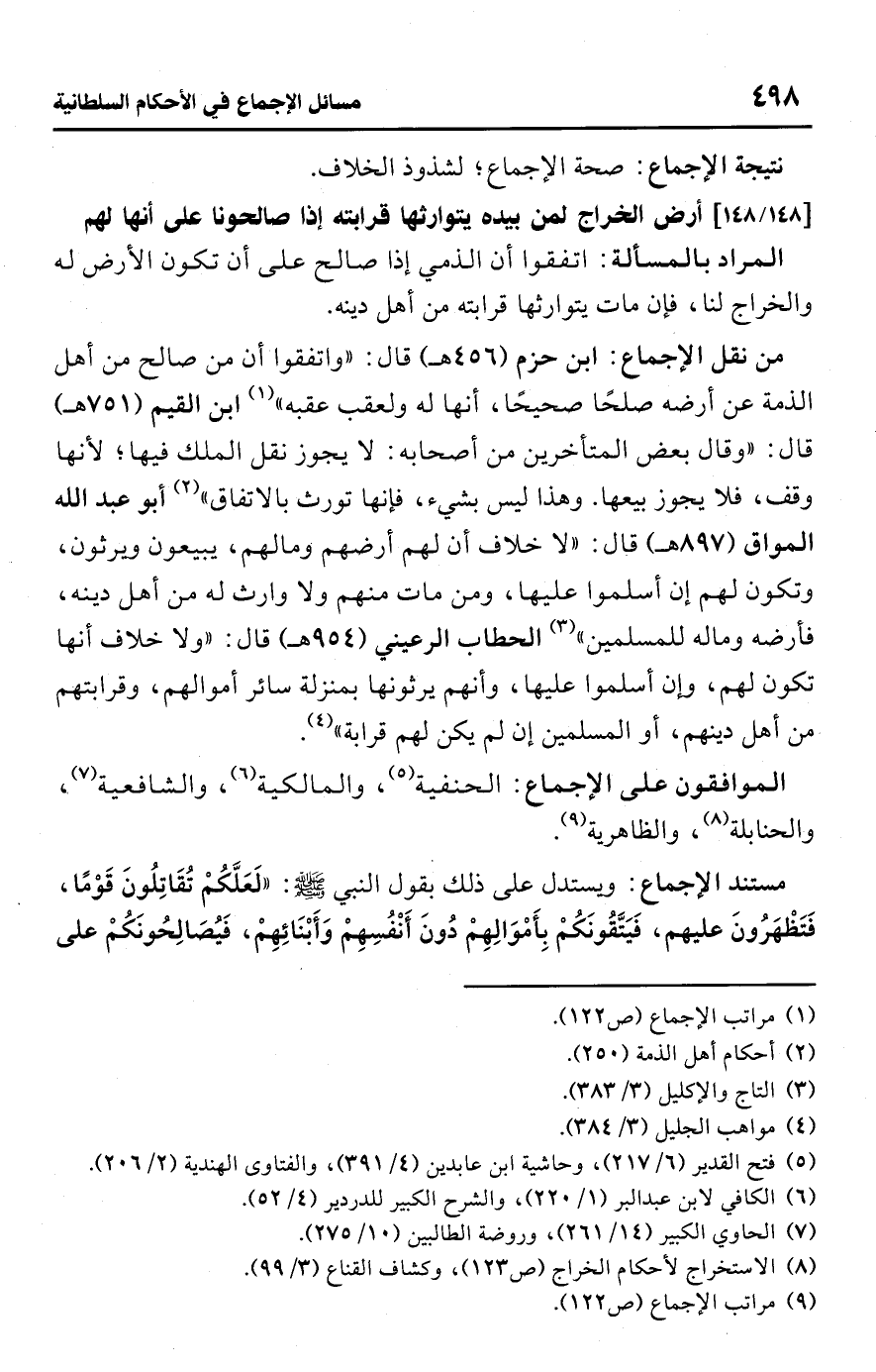 • من نقل الإجماع: ابن حزم (456 هـ) قال: "واتفقوا أن من صالح من أهل الذمة عن أرضه صلحًا صحيحًا، أنها له ولعقب عقبه" (¬1) ابن القيم (751 هـ) قال: "وقال بعض المتأخرين من أصحابه: لا يجوز نقل الملك فيها؛ لأنها وقف، فلا يجوز بيعها. وهذا ليس بشيء، فإنها تورث بالاتفاق" (¬2) أبو عبد اللَّه المواق (897 هـ) قال: "لا خلاف أن لهم أرضهم ومالهم، يبيعون ويرثون، وتكون لهم إن أسلموا عليها، ومن مات منهم ولا وارث له من أهل دينه، فأرضه وماله للمسلمين" (¬3) الحطاب الرعيني (954 هـ) قال: "ولا خلاف أنها تكون لهم، وإن أسلموا عليها، وأنهم يرثونها بمنزلة سائر أموالهم، وقرابتهم من أهل دينهم، أو المسلمين إن لم يكن لهم قرابة" (¬4).
