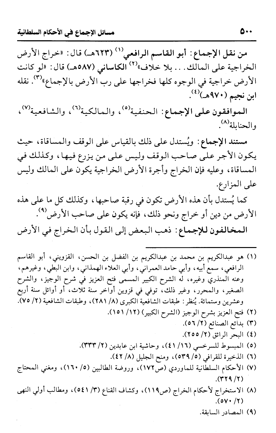 • من نقل الإجماع: أبو القاسم الرافعي (¬1) (623 هـ) قال: "خراج الأرض الخراجية على المالك. . . بلا خلاف" (¬2) الكاساني (587 هـ) قال: "لو كانت الأرض خراجية في الوجوه كلها فخراجها على رب الأرض بالإجماع" (¬3). نقله ابن نجيم (970 هـ) (¬4).