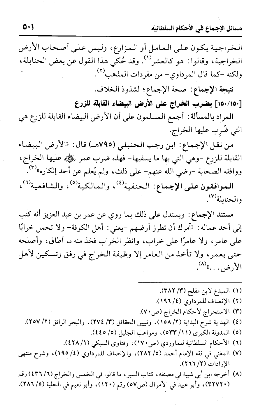 • من نقل الإجماع: ابن رجب الحنبلي (795 هـ) قال: "الأرض البيضاء القابلة للزرع -وهي التي بها ما يسقيها- فهذه ضرب عمر -رضي اللَّه عنه- عليها الخراج، ووافقه الصحابة -رضي اللَّه عنهم- على ذلك، ولم يُعلم عن أحد إنكاره" (¬3).