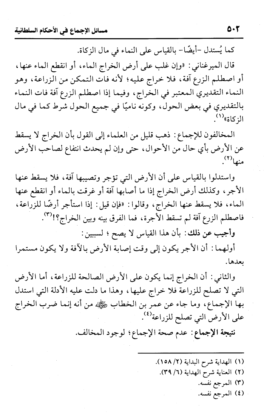 والثاني: أن الخراج إنما يكون على الأرض الصالحة للزراعة، أما الأرض التي لا تصلح للزراعة فلا خراج عليها، وهذا ما دلت عليه الأدلة التي استدل بها الإجماع، وما جاء عن عمر بن الخطاب -رضي اللَّه عنه- من أنه إنما ضرب الخراج على الأرض التي تصلح للزراعة (¬4).Rعدم صحة الإجماع؛ لوجود المخالف.