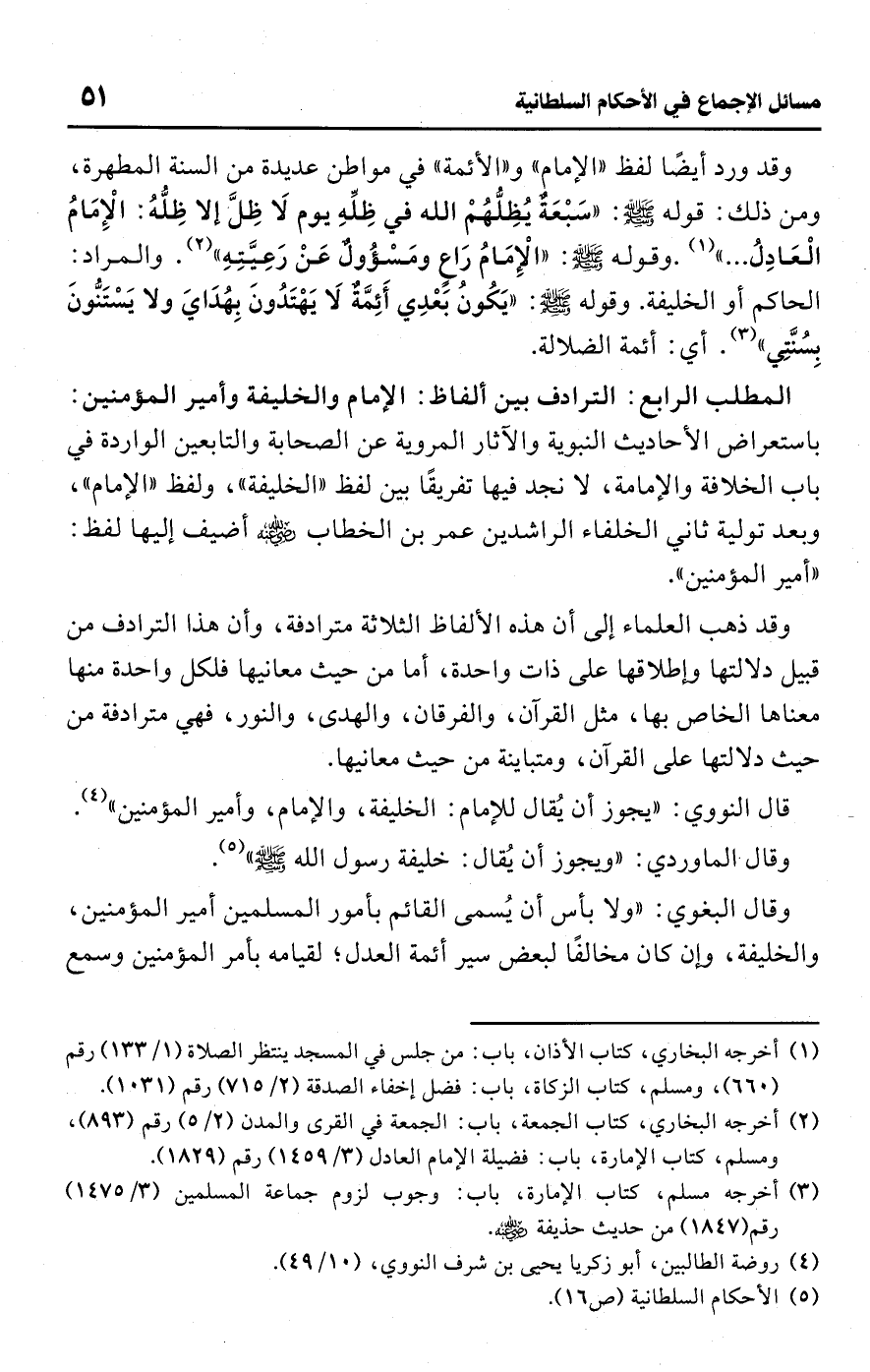 المطلب الرابع: الترادف بين ألفاظ: الإمام والخليفة وأمير المؤمنين: باستعراض الأحاديث النبوية والآثار المروية عن الصحابة والتابعين الواردة في باب الخلافة والإمامة، لا نجد فيها تفريقًا بين لفظ "الخليفة"، ولفظ "الإمام"، وبعد تولية ثاني الخلفاء الراشدين عمر بن الخطاب -رضي اللَّه عنه- أضيف إليها لفظ: "أمير المؤمنين".