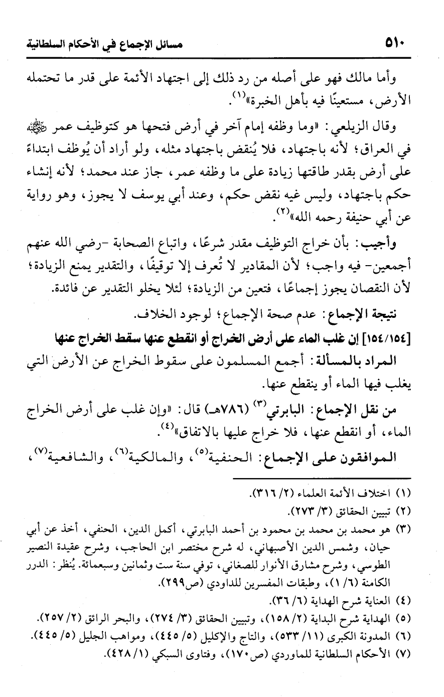 • من نقل الإجماع: البابرتي (¬3) (786 هـ) قال: "وإن غلب على أرض الخراج الماء، أو انقطع عنها، فلا خراج عليها بالاتفاق" (¬4).