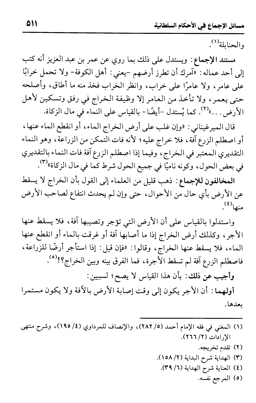 واستدلوا بالقياس على أن الأرض التي تؤجر وتصيبها آفة، فلا يسقط عنها الأجر، وكذلك أرض الخراج إذا ما أصابها آفة أو غرقت بالماء أو انقطع عنها الماء، فلا يسقط عنها الخراج، وقالوا: "فإن قيل: إذا استأجر أرضا للزراعة، فاصطلم الزرع آفة لم تسقط الأجرة، فما الفرق بينه وبين الخراج؟ ! (¬5).