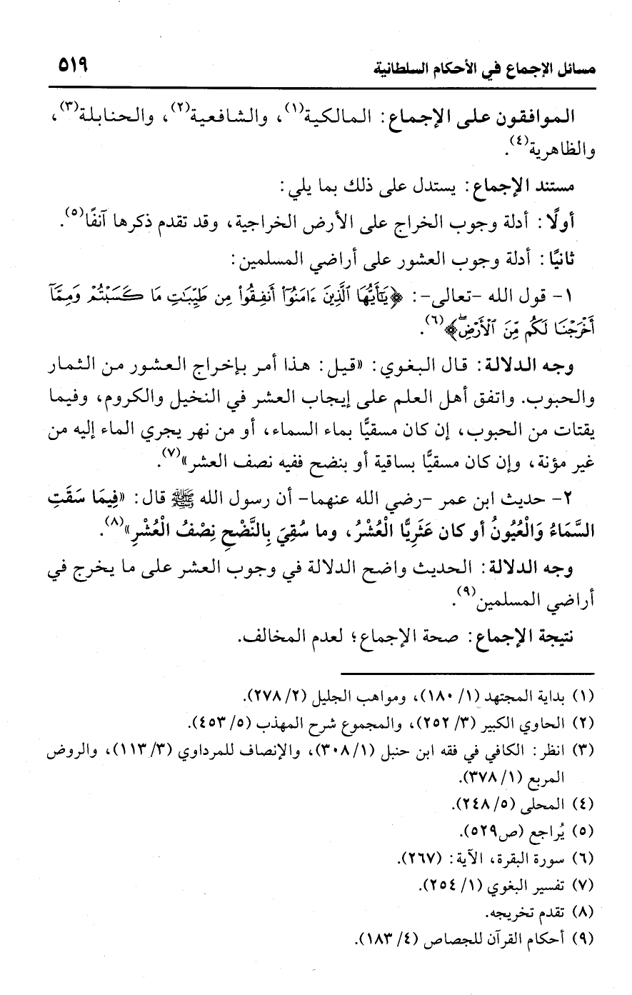 • وجه الدلالة: الحديث واضح الدلالة في وجوب العشر على ما يخرج في أراضي المسلمين (¬9).Rصحة الإجماع؛ لعدم المخالف.