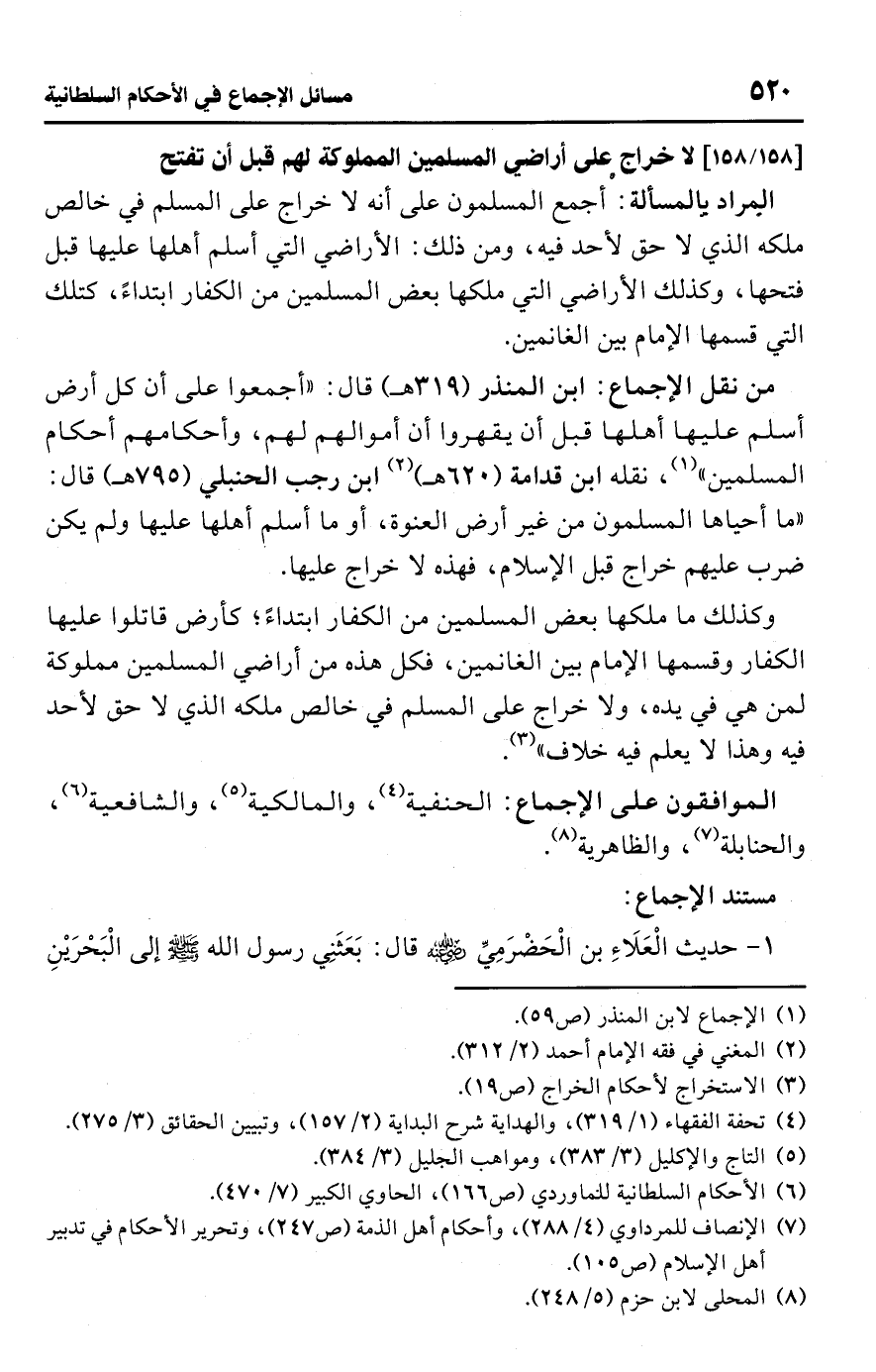 • من نقل الإجماع: ابن المنذر (319 هـ) قال: "أجمعوا على أن كل أرض أسلم عليها أهلها قبل أن يقهروا أن أموالهم لهم، وأحكامهم أحكام المسلمين" (¬1)، نقله ابن قدامة (620 هـ) (¬2) ابن رجب الحنبلي (795 هـ) قال: "ما أحياها المسلمون من غير أرض العنوة، أو ما أسلم أهلها عليها ولم يكن ضرب عليهم خراج قبل الإسلام، فهذه لا خراج عليها.