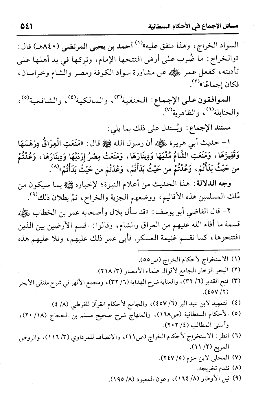 السواد الخراج، وهذا متفق عليه" (¬1) أحمد بن يحيى المرتضى (840 هـ) قال: "والخراج: ما ضُرب على أرض افتتحها الإمام، وتركها في يد أهلها على تأديته، كفعل عمر -رضي اللَّه عنه- عن مشاورة سواد الكوفة ومصر والشام وخراسان، فكان إجماعًا" (¬2).