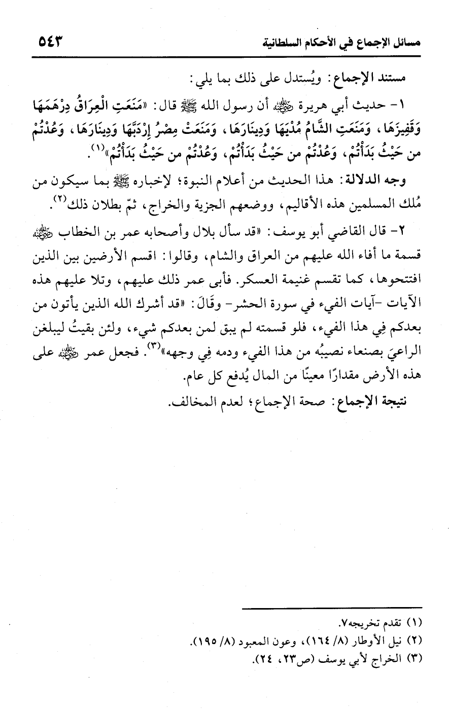 2 - قال القاضي أبو يوسف: "قد سأل بلال وأصحابه عمر بن الخطاب -رضي اللَّه عنه- قسمة ما أفاء اللَّه عليهم من العراق والشام، وقالوا: اقسم الأرضين بين الذين افتتحوها، كما تقسم غنيمة العسكر. فأبى عمر ذلك عليهم، وتلا عليهم هذه الآيات -آيات الفيء في سورة الحشر- وقَالَ: "قد أشرك اللَّه الذين يأتون من بعدكم فِي هذا الفيء، فلو قسمته لم يبق لمن بعدكم شيء، ولئن بقيتُ ليبلغن الراعيَ بصنعاء نصيبُه من هذا الفيء ودمه فِي وجهه" (¬3). فجعل عمر -رضي اللَّه عنه- على هذه الأرض مقدارًا معينًا من المال يُدفع كل عام.Rصحة الإجماع؛ لعدم المخالف.
