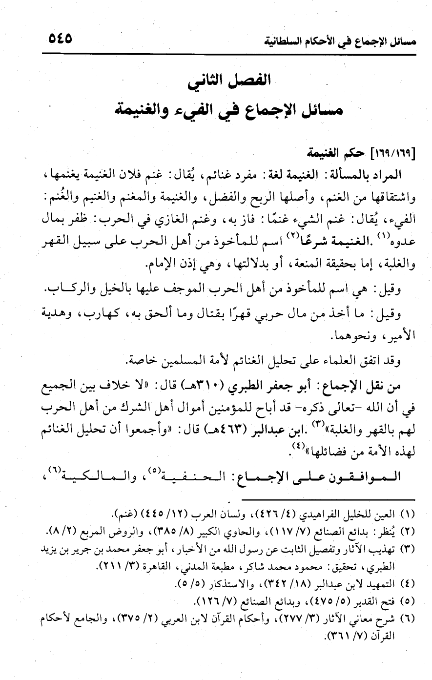 • من نقل الإجماع: أبو جعفر الطبري (310 هـ) قال: "لا خلاف بين الجميع في أن اللَّه -تعالى ذكره- قد أباح للمؤمنين أموال أهل الشرك من أهل الحرب لهم بالقهر والغلبة" (¬3). ابن عبد البر (463 هـ) قال: "وأجمعوا أن تحليل الغنائم لهذه الأمة من فضائلها" (¬4).