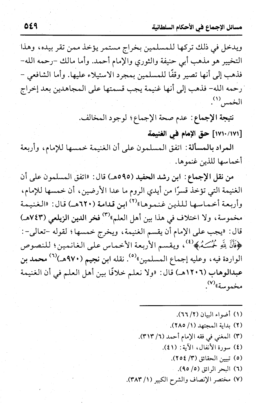 • من نقل الإجماع: ابن رشد الحفيد (595 هـ) قال: "اتفق المسلمون على أن الغنيمة التي تؤخذ قسرًا من أيدي الروم ما عدا الأرضين، أن خمسها للإمام، وأربعة أخماسها للذين غنموها" (¬2) ابن قدامة (620 هـ) قال: "الغنيمة مخموسة، ولا اختلاف في هذا بين أهل العلم" (¬3) فخر الدين الزيلعي (743 هـ) قال: "يجب على الإمام أن يقسم الغنيمة، ويخرج خمسها؛ لقوله -تعالى-: {فَأَنَّ لِلَّهِ خُمُسَهُ} (¬4)، ويقسم الأربعة الأخماس على الغانمين؛ للنصوص الواردة فيه، وعليه إجماع المسلمين" (¬5). نقله ابن نجيم (970 هـ) (¬6) محمد بن عبد الوهاب (1206 هـ) قال: "ولا نعلم خلافًا بين أهل العلم في أن الغنيمة مخموسة" (¬7).