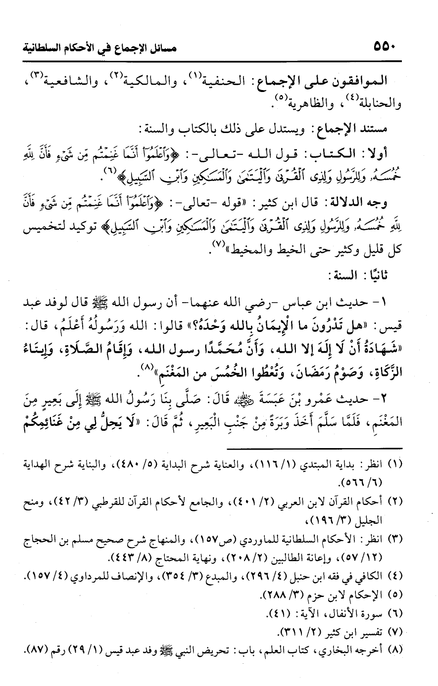 أولا: الكتاب: قول اللَّه -تعالى-: {وَاعْلَمُوا أَنَّمَا غَنِمْتُمْ مِنْ شَيْءٍ فَأَنَّ لِلَّهِ خُمُسَهُ وَلِلرَّسُولِ وَلِذِي الْقُرْبَى وَالْيَتَامَى وَالْمَسَاكِينِ وَابْنِ السَّبِيلِ} (¬6).