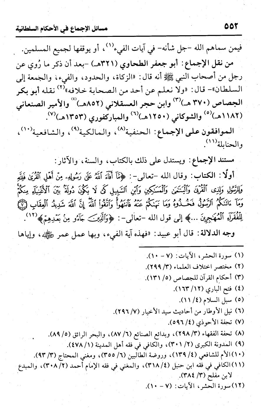 • من نقل الإجماع: أبو جعفر الطحاوي (321 هـ) -بعد أن ذكر ما رُدري عن رجل من أصحاب النبي -صلى اللَّه عليه وسلم- أنه قال: "الزكاة، والحدود، والفيء، والجمعة إلى السلطان"- قال: "ولا نعلم عن أحد من الصحابة خلافه" (¬2) نقله أبو بكر الجصاص (370 هـ) (¬3) وابن حجر العسقلاني (852 هـ) (¬4) والأمير الصنعاني (1182 هـ) (¬5) والشوكاني (1250 هـ) (¬6) والمباركفوري (1353 هـ) (¬7).