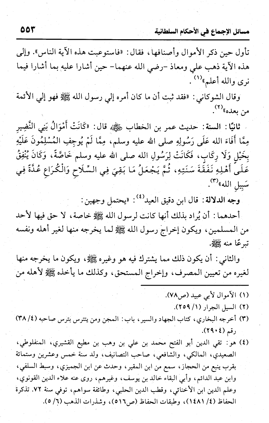 • ثانيًا: السنة: حديث عمر بن الخطاب -رضي اللَّه عنه- قال: "كَانَتْ أَمْوَالُ بَنِي النَّضيرِ مِمَّا أَفَاءَ اللَّه عَلَى رَسُولِهِ صلى اللَّه عليه وسلم، مِمَّا لَمْ يُوجِفِ المُسْلِمُونَ عَلَيْهِ بِخَيْل وَلَا رِكَاب، فَكَانَتْ لِرَسُولِ اللَّه صلى اللَّه عليه وسلم خَاصَّةً، وَكَانَ يُنْفِقُ عَلَى أَهْلِهِ نَفَقَةَ سَنَتِهِ، ثُمَّ يَجْعَلُ مَا بَقِيَ فِي السِّلَاحِ وَالْكُرَاعِ عُدَّةً فِي سَبِيلِ اللَّه" (¬3).