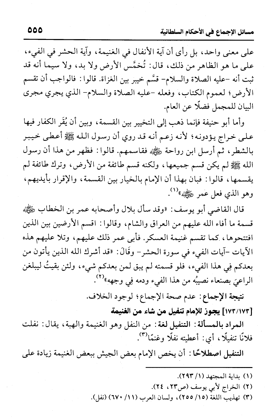 قال القاضي أبو يوسف: "وقد سأل بلال وأصحابه عمر بن الخطاب -رضي اللَّه عنه- قسمة ما أفاء اللَّه عليهم من العراق والشام، وقالوا: اقسم الأرضين بين الذين افتتحوها، كما تقسم غنيمة العسكر. فأبى عمر ذلك عليهم، وتلا عليهم هذه الآيات -آيات الفيء في سورة الحشر- وقَالَ: "قد أشرك اللَّه الذين يأتون من بعدكم فِي هذا الفيء، فلو قسمته لم يبق لمن بعدكم شيء، ولئن بقيتُ ليبلغن الراعيَ بصنعاء نصيبُه من هذا الفيء ودمه فِي وجهه" (¬2).Rعدم صحة الإجماع؛ لوجود الخلاف.