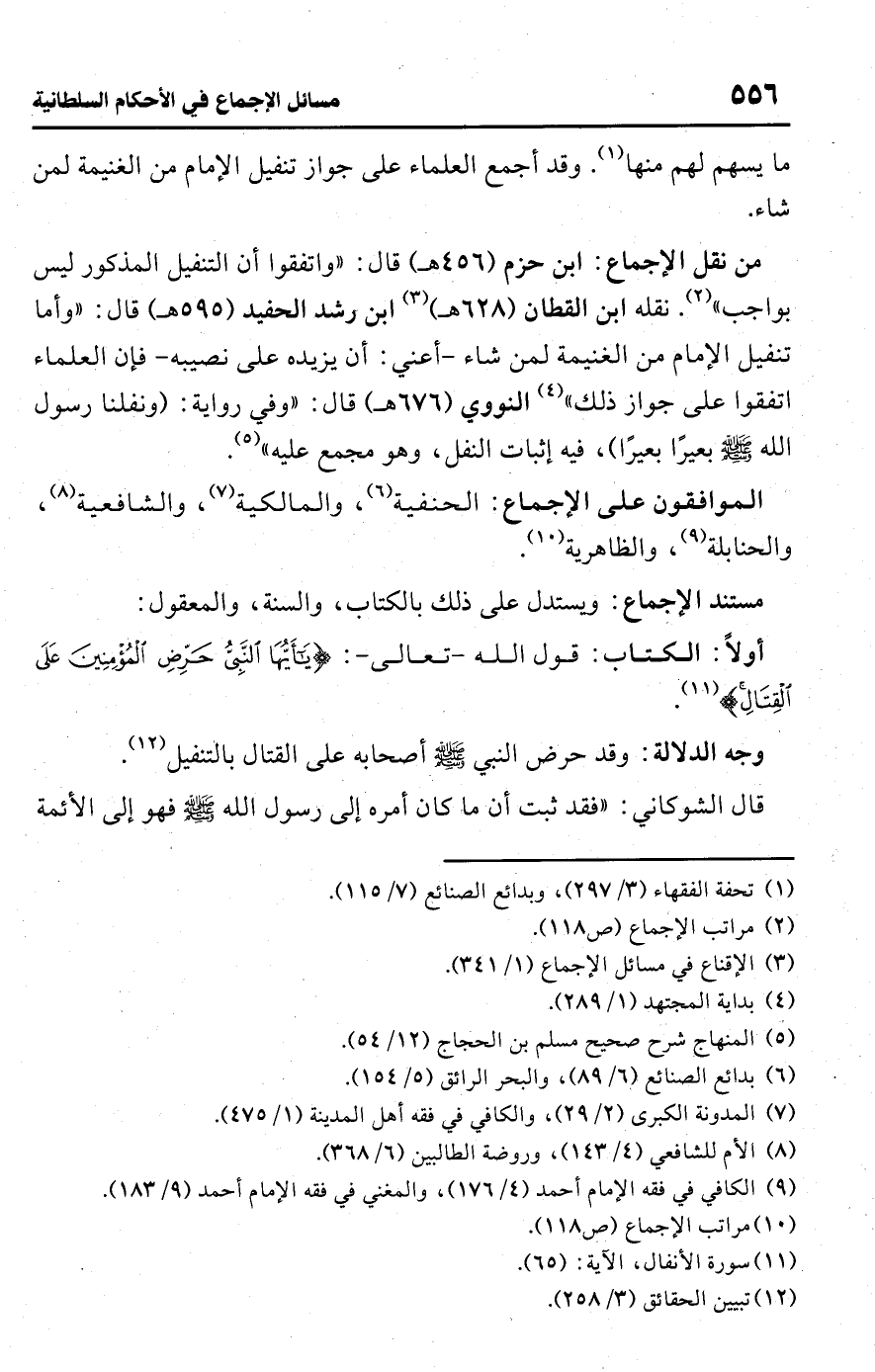 • من نقل الإجماع: ابن حزم (456 هـ) قال: "واتفقوا أن التنفيل المذكور ليس بواجب" (¬2). نقله ابن القطان (628 هـ) (¬3) ابن رشد الحفيد (595 هـ) قال: "وأما تنفيل الإمام من الغنيمة لمن شاء -أعني: أن يزيده على نصيبه- فإن العلماء اتفقوا على جواز ذلك" (¬4) النووي (676 هـ) قال: "وفي رواية: (ونفلنا رسول اللَّه -صلى اللَّه عليه وسلم-، وفيه إثبات النفل، وهو مجمع عليه" (¬5).