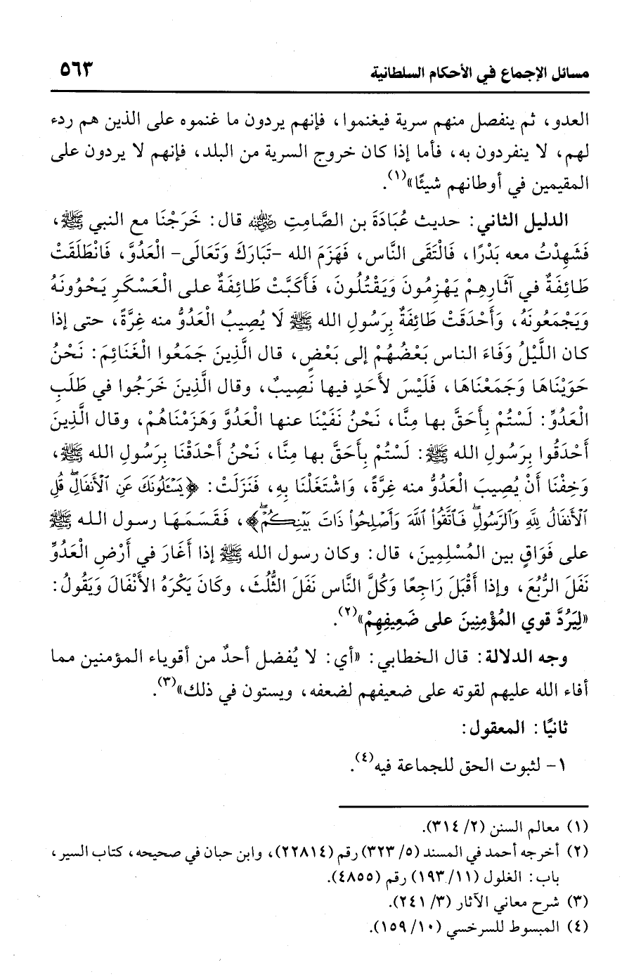 الدليل الثاني: حديث عُبَادَةَ بن الصَّامِتِ -رضي اللَّه عنه- قال: خَرَجْنَا مع النبي -صلى اللَّه عليه وسلم-، فَشَهِدْتُ معه بَدْرًا، فَالْتَقَى الناس، فَهَزَمَ اللَّه -تَبَارَكَ وَتَعَالَى- الْعَدُوَّ، فَانْطَلَقَتْ طَائِفَةٌ في آثَارِهِمْ يَهْزِمُونَ وَيَقْتُلُونَ، فَأَكَبَّتْ طَائِفَةٌ على الْعَسْكَرِ يَحْوُونَهُ وَيَجْمَعُونَهُ، وَأَحْدَقَتْ طَائِفَة بِرَسُول اللَّه -صلى اللَّه عليه وسلم- لَا يُصِيبُ الْعَدُوُّ منه غِرَّةً، حتى إذا كان اللَّيْلُ وَفَاءَ الناس بَعْضُهُمْ إلى بَعْضٍ، قال الَّذِينَ جَمَعُوا الْغَنَائِمَ: نَحْنُ حَوَيْنَاهَا وَجَمَعْنَاهَا، فَلَيْس لأَحَدٍ فيها نَصِيبٌ، وقال الَّذِينَ خَرَجُوا في طَلَبِ الْعَدُوِّ: لَسْتُمْ بِأَحَقَّ بها مِنَّا، نَحْنُ نَفَيْنَا عنها الْعَدُوَّ وَهَزَمْنَاهُمْ، وقال الَّذِينَ أَحْدَقُوا بِرَسُول اللَّه -صلى اللَّه عليه وسلم-: لَسْتُمْ بِأَحَقَّ بها مِنَّا، نَحْنُ أَحْدَقْنَا بِرَسُول اللَّه -صلى اللَّه عليه وسلم-، وَخِفْنَا أَنْ يُصِيبَ الْعَدُوُّ منه غِرَّةً، وَاشْتَغَلْنَا بِهِ، فَنَزَلَتْ: {يَسْأَلُونَكَ عَنِ الْأَنْفَالِ قُلِ الْأَنْفَالُ لِلَّهِ وَالرَّسُولِ فَاتَّقُوا اللَّهَ وَأَصْلِحُوا ذَاتَ بَيْنِكُمْ}، فَقَسَمَهَا رسول اللَّه -صلى اللَّه عليه وسلم- على فَوَاقٍ بين المُسْلِمِينَ، قال: وكان رسول اللَّه -صلى اللَّه عليه وسلم- إذا أَغَارَ في أَرْضِ الْعَدُوِّ نَفَلَ الرُّبُعَ، وإذا أَقْبَلَ رَاجِعًا وَكُلَّ الناس نَفَلَ الثُّلُثَ، وكَانَ يَكْرَهُ الأَنْفَال وَيَقُول: "لِيَرُدَّ قوي المُؤْمِنِينَ على ضَعِيفِهِمْ" (¬2).
