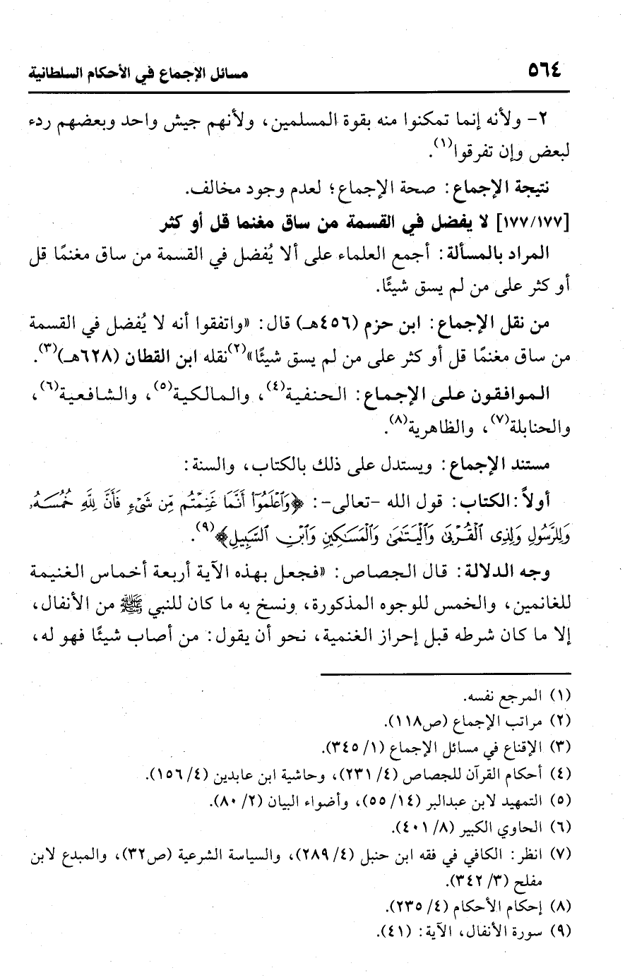 • من نقل الإجماع: ابن حزم (456 هـ) قال: "واتفقوا أنه لا يُفضل في القسمة من ساق مغنمًا قل أو كثر على من لم يسق شيئًا" (¬2) نقله ابن القطان (628 هـ) (¬3).