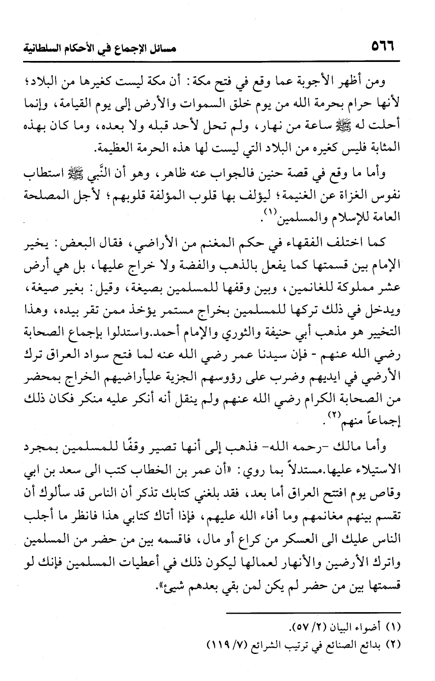 كما اختلف الفقهاء في حكم المغنم من الأراضي، فقال البعض: يخير الإمام بين قسمتها كما يفعل بالذهب والفضة ولا خراج عليها، بل هي أرض عشر مملوكة للغانمين، وبين وقفها للمسلمين بصيغة، وقيل: بغير صيغة، ويدخل في ذلك تركها للمسلمين بخراج مستمر يؤخذ ممن تقر بيده، وهذا التخيير هو مذهب أبي حنيفة والثوري والإمام أحمد. واستدلوا بإجماع الصحابة -رضي اللَّه عنهم- فإن سيدنا عمر رضي اللَّه عنه لما فتح سواد العراق ترك الأرضي في أيديهم وضرب على رؤوسهم الجزية على أراضيهم الخراج بمحضر من الصحابة الكرام رضي اللَّه عنهم ولم ينقل أنه أنكر عليه منكر فكان ذلك إجماعًا منهم (¬2).