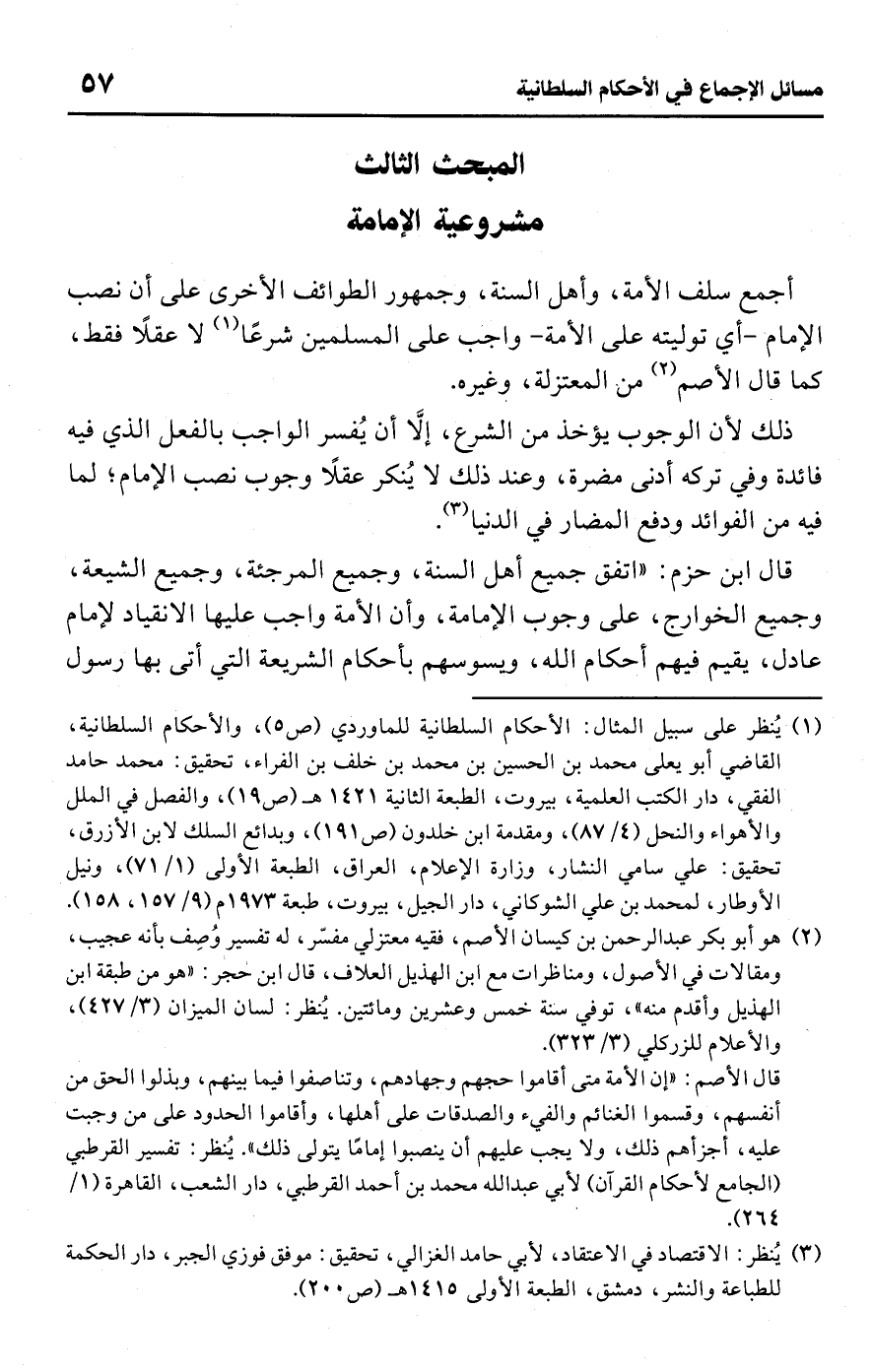 (¬1) يُنظر على سبيل المثال: الأحكام السلطانية للماوردي (ص 5)، والأحكام السلطانية، القاضي أبو يعلى محمد بن الحسين بن محمد بن خلف بن الفراء، تحقيق: محمد حامد الفقي، دار الكتب العلمية، بيروت، الطبعة الثانية 1421 هـ (ص 19)، والفصل في الملل والأهواء والنحل (4/ 87)، ومقدمة ابن خلدون (ص 191)، وبدائع السلك لابن الأزرق، تحقيق: على سامي النشار، وزارة الإعلام، العراق، الطبعة الأولى (1/ 71)، ونيل الأوطار، لمحمد بن علي الشوكاني، دار الجيل، بيروت، طبعة 1973 م (9/ 157، 158).
