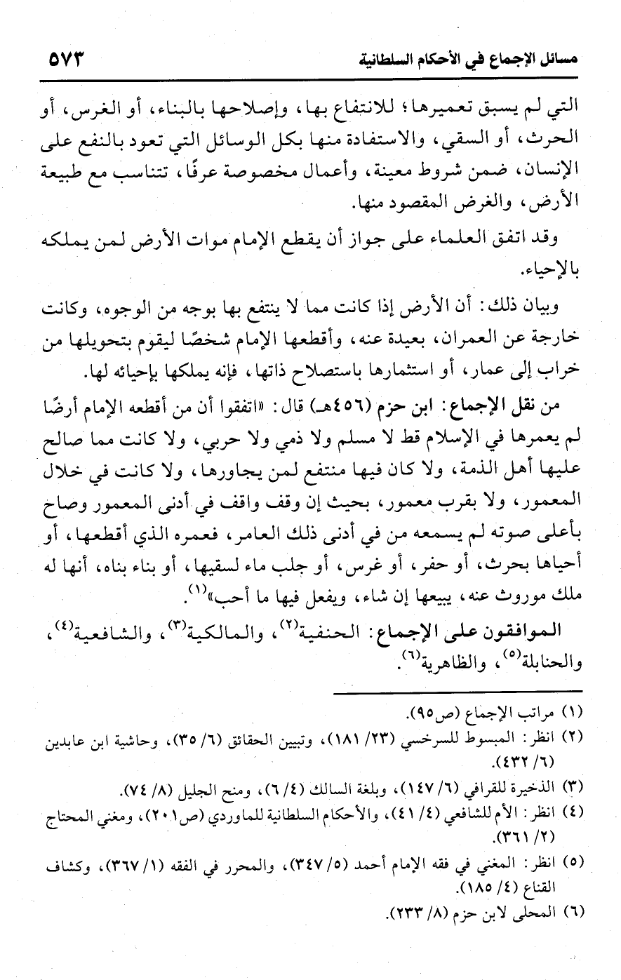 • من نقل الإجماع: ابن حزم (456 هـ) قال: "اتفقوا أن من أقطعه الإمام أرضًا لم يعمرها في الإسلام قط لا مسلم ولا ذمي ولا حربي، ولا كانت مما صالح عليها أهل الذمة، ولا كان فيها منتفع لمن يجاورها، ولا كانت في خلال المعمور، ولا بقرب معمور، بحيث إن وقف واقف في أدنى المعمور وصاح بأعلى صوته لم يسمعه من في أدنى ذلك العامر، فعمره الذي أقطعها، أو أحياها بحرث، أو حفر، أو غرس، أو جلب ماء لسقيها، أو بناء بناه، أنها لى ملك موروث عنه، يبيعها إن شاء، ويفعل فيها ما أحب" (¬1).