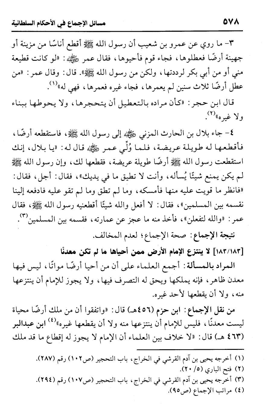 • من نقل الإجماع: ابن حزم (456 هـ) قال: "واتفقوا أن من ملك أرضًا محياة ليست معدنًا، فليس للإمام أن ينتزعها منه ولا أن يقطعها غيره" (¬4) ابن عبد البر (463 هـ) قال: "لا خلاف بين العلماء أن الإمام لا يجوز له إقطاع ما قد ملك