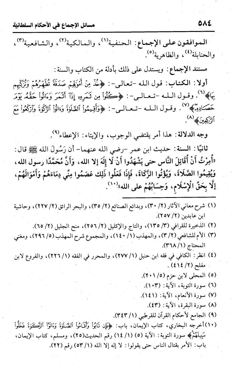 • ثانيًا: السنة: حديث ابن عمر -رضي اللَّه عنهما- أن رَسُولَ اللَّه -صلى اللَّه عليه وسلم- قال: "أُمِرْتُ أَنْ أُقَاتِلَ الناس حتى يَشْهَدُوا أَنِ لَا إِلَهَ إلا اللَّه، وَأَنَّ مُحَمَّدًا رسول اللَّه، وَيُقِيمُوا الصَّلَاةَ، وَيُؤْتُوا الزَّكَاةَ، فَإِذَا فَعَلُوا ذَلِك عَصَمُوا مِنِّي دِمَاءَهُمْ وَأَمْوَالَهُمْ، إلا بِحَقِّ الْإِسْلَامِ، وَحِسَابُهُمْ على اللَّه" (¬10).