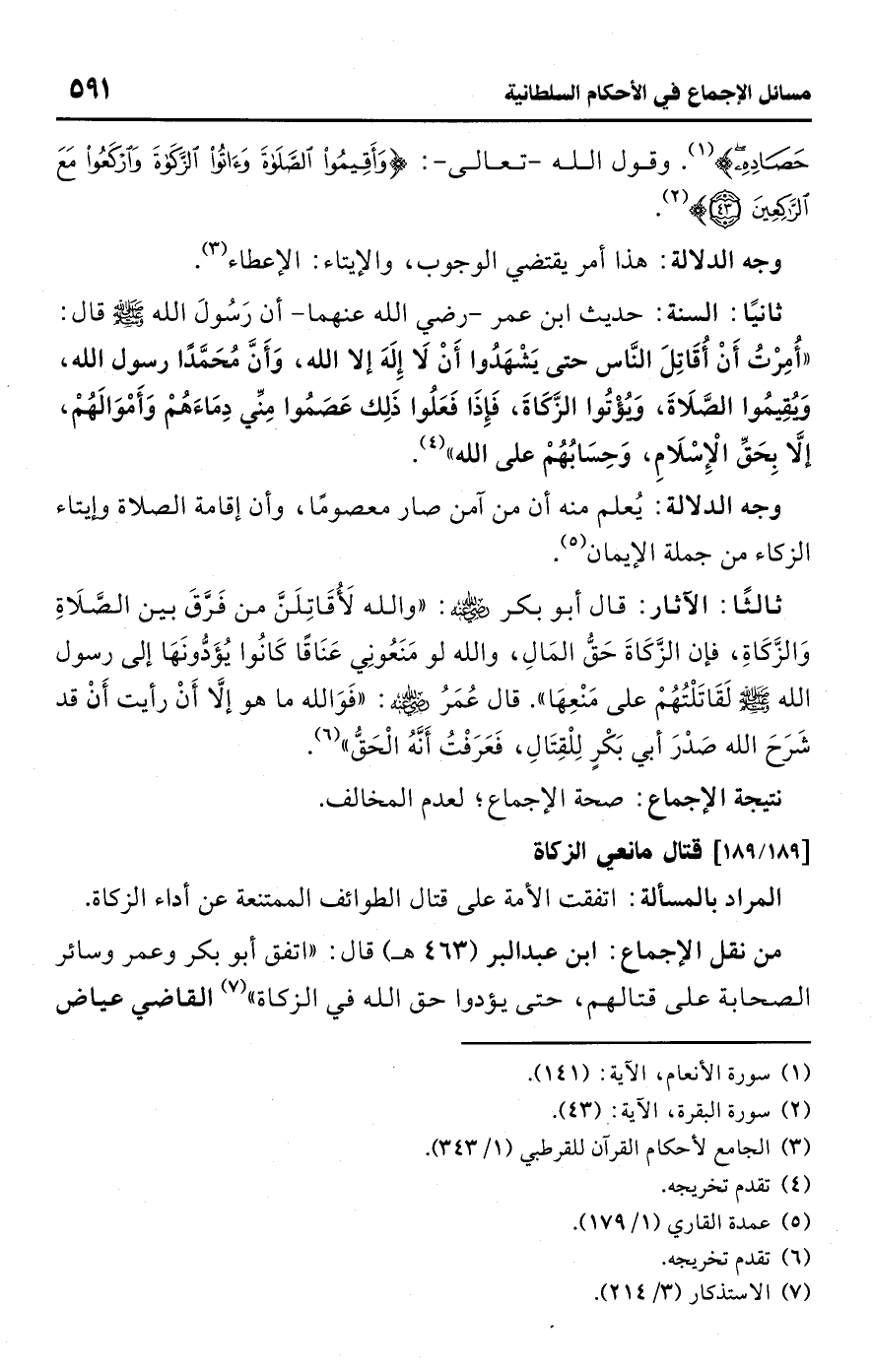 • من نقل الإجماع: ابن عبد البر (463 هـ) قال: "اتفق أبو بكر وعمر وسائر الصحابة على قتالهم، حتى يؤدوا حق اللَّه في الزكاة" (¬7) القاضي عياض (544 هـ)