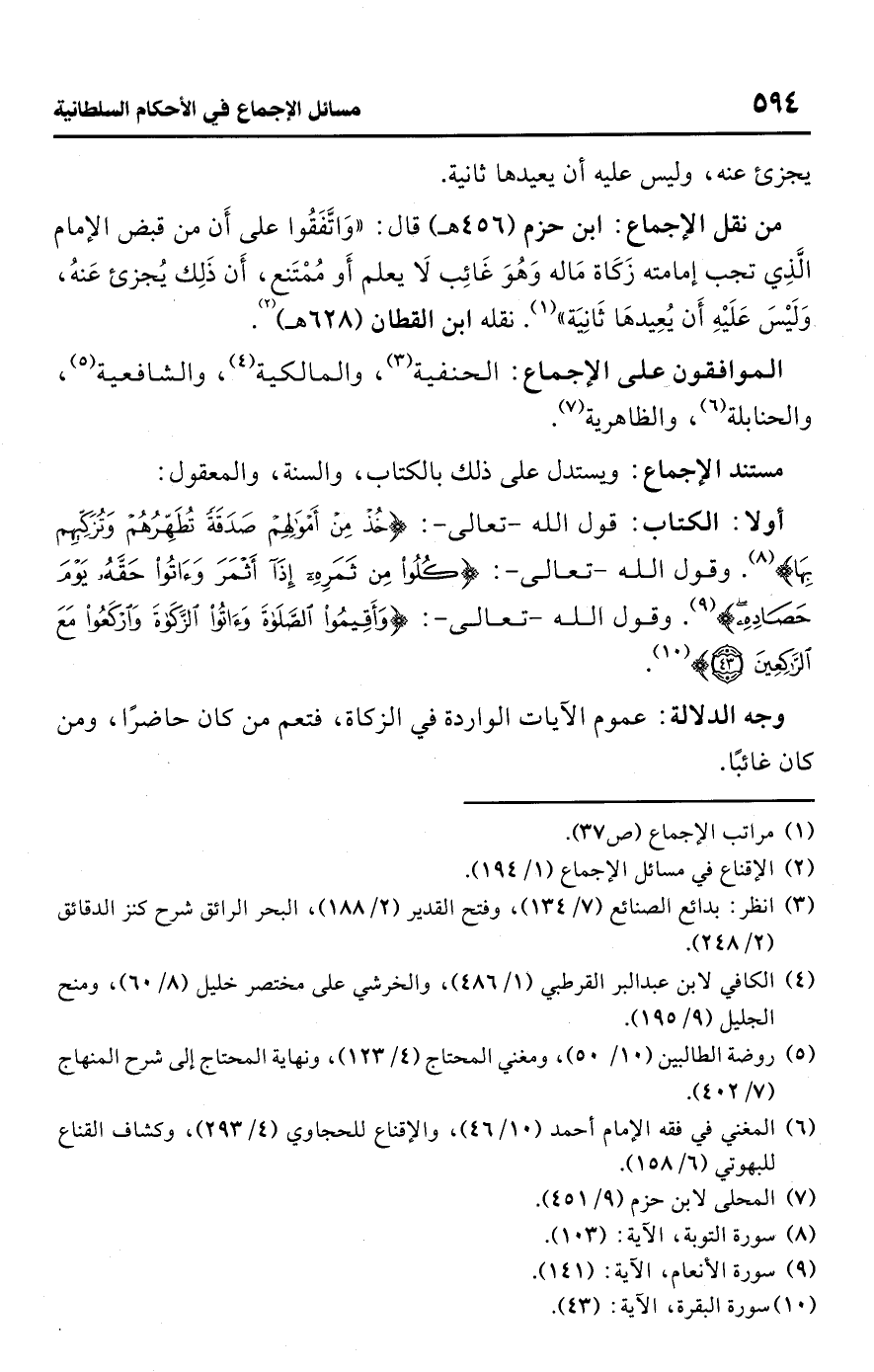 • من نقل الإجماع: ابن حزم (456 هـ) قال: "وَاتَّفَقُوا على أَن من قبض الإمام الَّذِي تجب إمامته زَكَاة مَاله وَهُوَ غَائِب لَا يعلم أَو مُمْتَنع، أَن ذَلِك يُجزئ عَنهُ، وَلَيْسَ عَلَيْهِ أَن يُعِيدهَا ثَانِيَة" (¬1). نقله ابن القطان (628 هـ) (¬2).