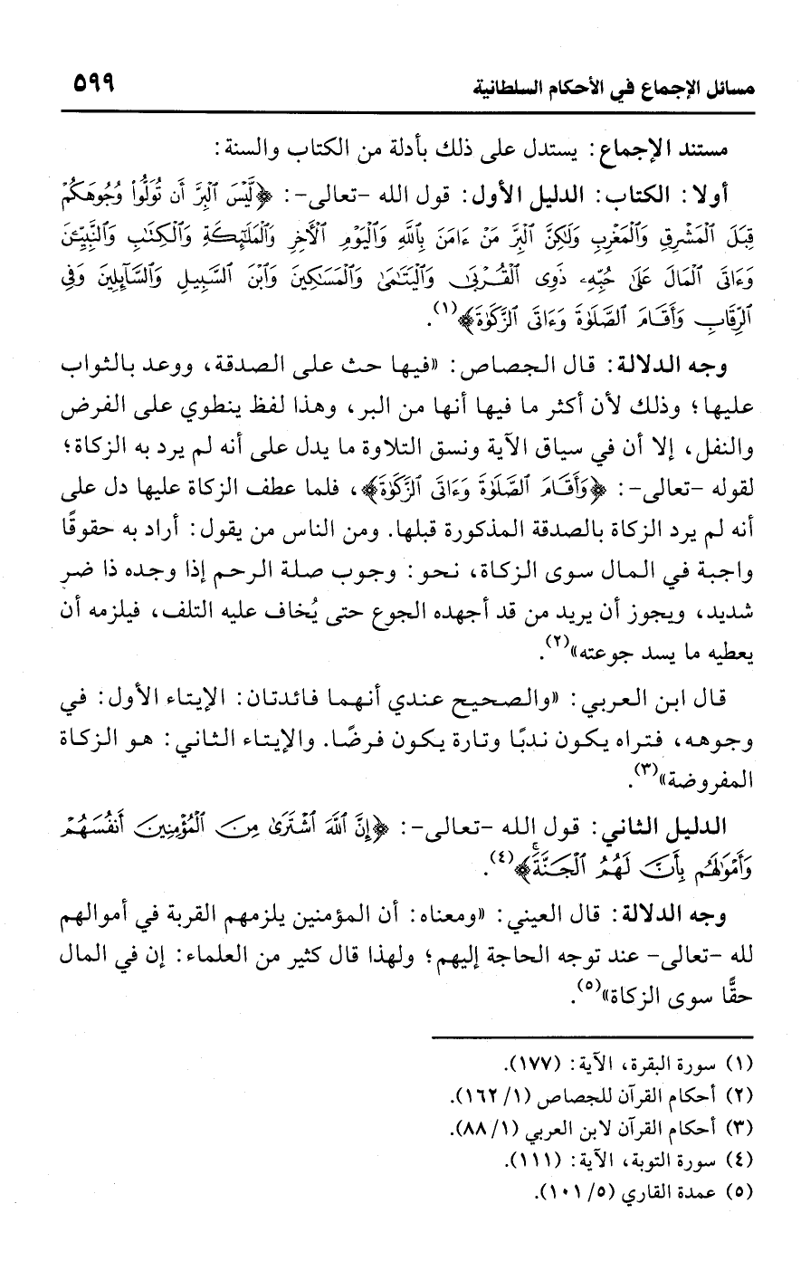 • أولا: الكتاب: الدليل الأول: قول اللَّه -تعالى-: {لَيْسَ الْبِرَّ أَنْ تُوَلُّوا وُجُوهَكُمْ قِبَلَ الْمَشْرِقِ وَالْمَغْرِبِ وَلَكِنَّ الْبِرَّ مَنْ آمَنَ بِاللَّهِ وَالْيَوْمِ الْآخِرِ وَالْمَلَائِكَةِ وَالْكِتَابِ وَالنَّبِيِّينَ وَآتَى الْمَالَ عَلَى حُبِّهِ ذَوِي الْقُرْبَى وَالْيَتَامَى وَالْمَسَاكِينَ وَابْنَ السَّبِيلِ وَالسَّائِلِينَ وَفِي الرِّقَابِ وَأَقَامَ الصَّلَاةَ وَآتَى الزَّكَاةَ} (¬1).