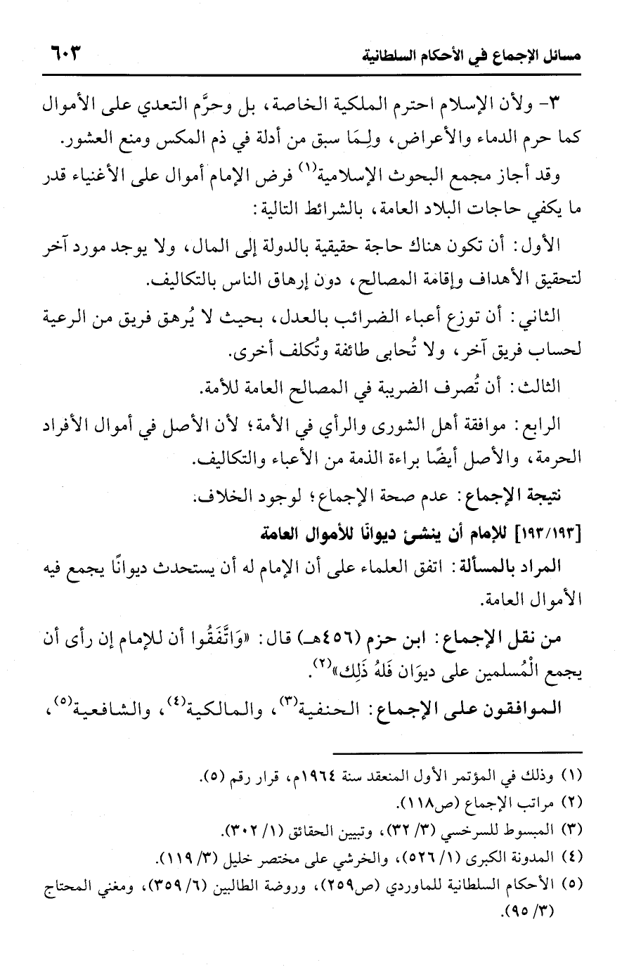 الرابع: موافقة أهل الشوري والرأي في الأمة؛ لأن الأصل في أموال الأفراد الحرمة، والأصل أيضًا براءة الذمة من الأعباء والتكاليف.Rعدم صحة الإجماع؛ لوجود الخلاف.