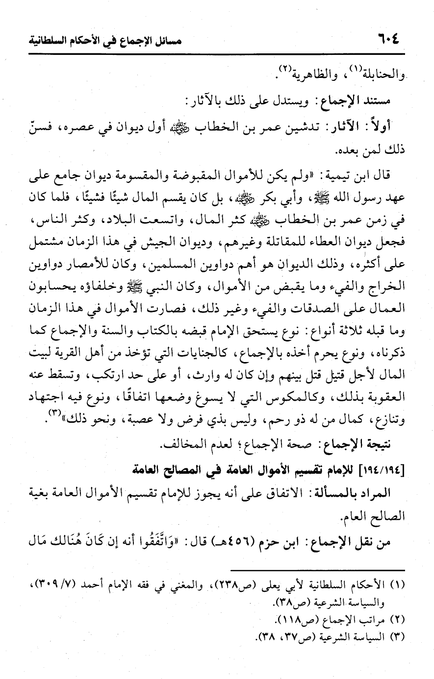 قال ابن تيمية: "ولم يكن للأموال المقبوضة والمقسومة ديوان جامع على عهد رسول اللَّه -صلى اللَّه عليه وسلم-، وأبي بكر -رضي اللَّه عنه-، بل كان يقسم المال شيئًا فشيئًا، فلما كان في زمن عمر بن الخطاب -رضي اللَّه عنه- كثر المال، واتسعت البلاد، وكثر الناس، فجعل ديوان العطاء للمقاتلة وغيرهم، وديوان الجيش في هذا الزمان مشتمل على أكثره، وذلك الديوان هو أهم دواوين المسلمين، وكان للأمصار دواوين الخراج والفيء وما يقبض من الأموال، وكان النبي -صلى اللَّه عليه وسلم- وخلفاؤه يحسابون العمال على الصدقات والفيء وغير ذلك، فصارت الأموال في هذا الزمان وما قبله ثلاثة أنواع: نوع يستحق الإمام قبضه بالكتاب والسنة والإجماع كما ذكرناه، ونوع يحرم أخذه بالإجماع، كالجنايات التي تؤخذ من أهل القرية لبيت المال لأجل قتيل قتل بينهم وإن كان له وارث، أو على حد ارتكب، وتسقط عنه العقوبة بذلك، وكالمكوس التي لا يسوغ وضعها اتفاقًا، ونوع فيه اجتهاد وتنازع، كمال من له ذو رحم، وليس بذي فرض ولا عصبة، ونحو ذلك" (¬3).Rصحة الإجماع؛ لعدم المخالف.