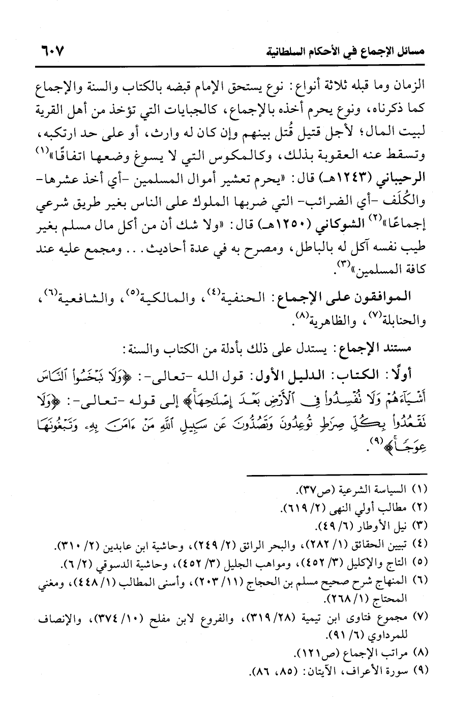 الزمان وما قبله ثلاثة أنواع: نوع يستحق الإمام قبضه بالكتاب والسنة والإجماع كما ذكرناه، ونوع يحرم أخذه بالإجماع، كالجبايات التي تؤخذ من أهل القرية لبيت المال؛ لأجل قتيل قُتل بينهم وإن كان له وارث، أو على حد ارتكبه، وتسقط عنه العقوبة بذلك، وكالمكوس التي لا يسوغ وضعها اتفاقًا" (¬1) الرحيباني (1243 هـ) قال: "يحرم تعشير أموال المسلمين -أي أخذ عشرها- والكُلَف -أي الضرائب- التي ضربها الملوك على الناس بغير طريق شرعي إجماعًا" (¬2) الشوكاني (1250 هـ) قال: "ولا شك أن من أكل مال مسلم بغير طيب نفسه آكل له بالباطل، ومصرح به في عدة أحاديث. . . ومجمع عليه عند كافة المسلمين" (¬3).