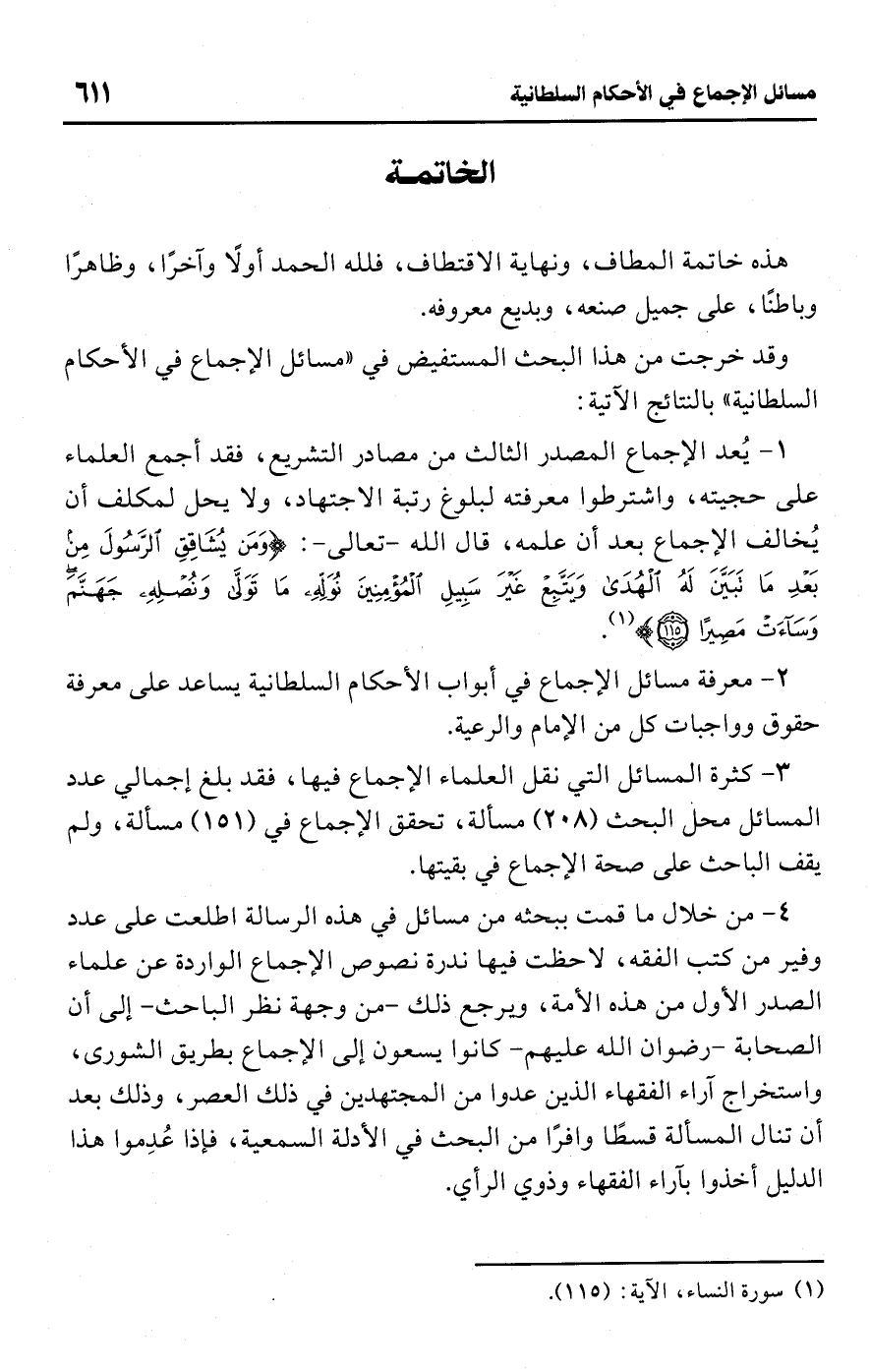 وقد خرجت من هذا البحث المستفيض في "مسائل الإجماع في الأحكام السلطانية" بالنتائج الآتية: