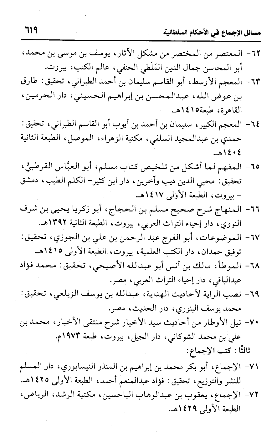 71 - الإجماع، أبو بكر محمد بن إبراهيم بن المنذر النيسابوري، دار المسلم للنشر والتوزيع، تحقيق: فؤاد عبد المنعم أحمد، الطبعة الأولى 1425 هـ.