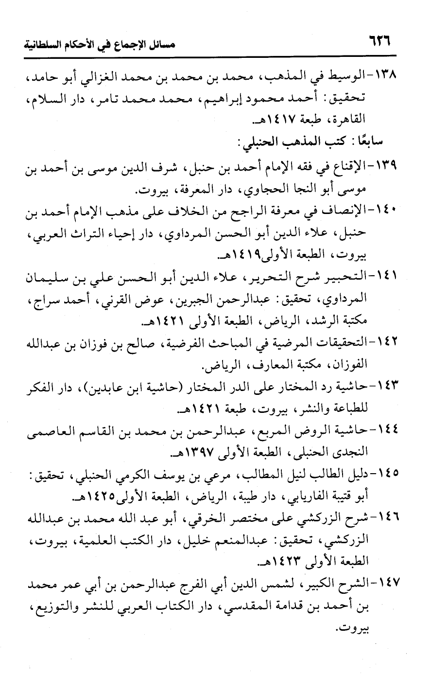 139 - الإقناع في فقه الإمام أحمد بن حنبل، شرف الدين موسى بن أحمد بن موسى أبو النجا الحجاوي، دار المعرفة، بيروت.