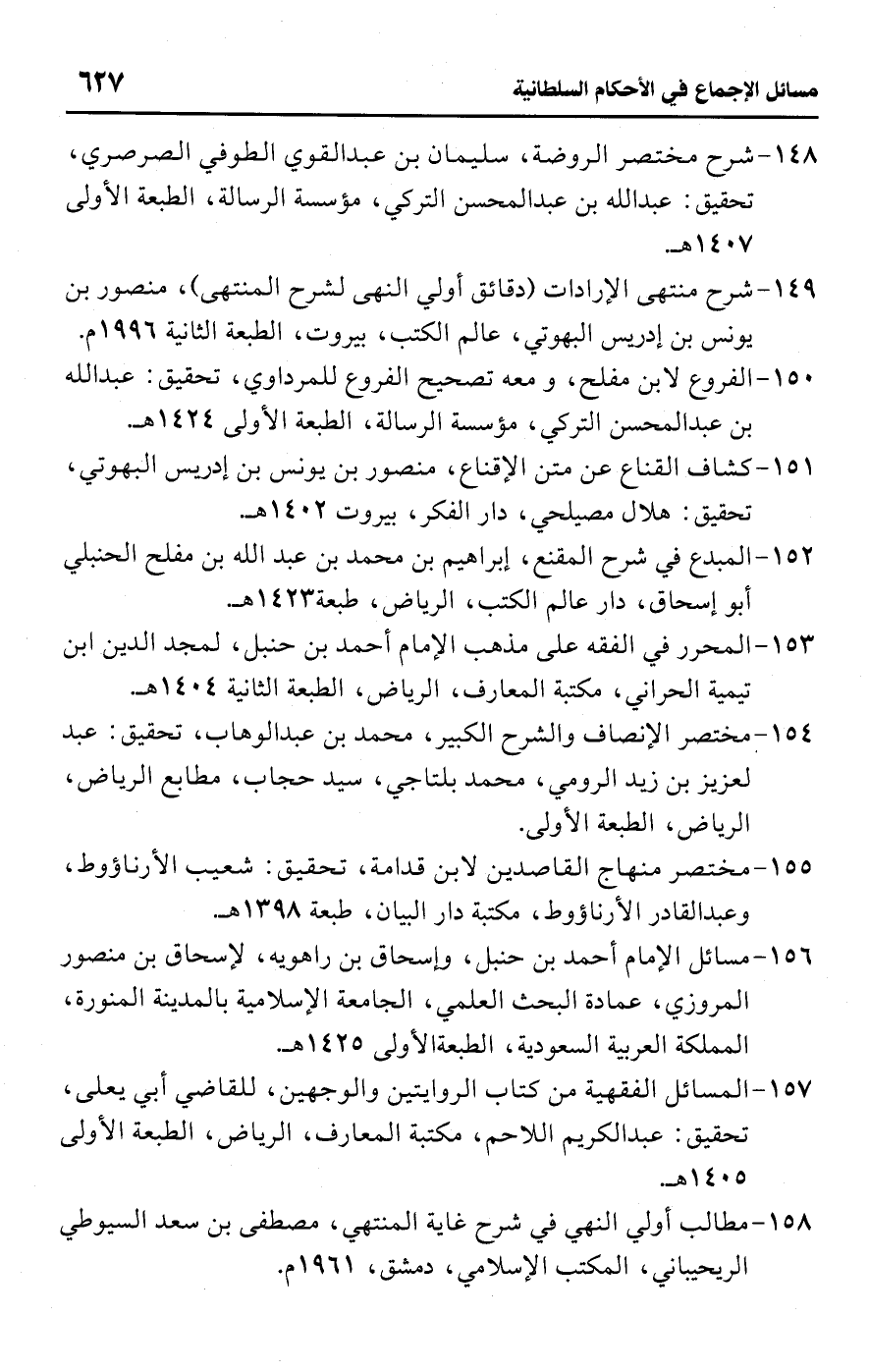 149 - شرح منتهى الإرادات (دقائق أولي النهى لشرح المنتهى)، منصور بن يونس بن إدريس البهوتي، عالم الكتب، بيروت، الطبعة الثانية 1996 م.