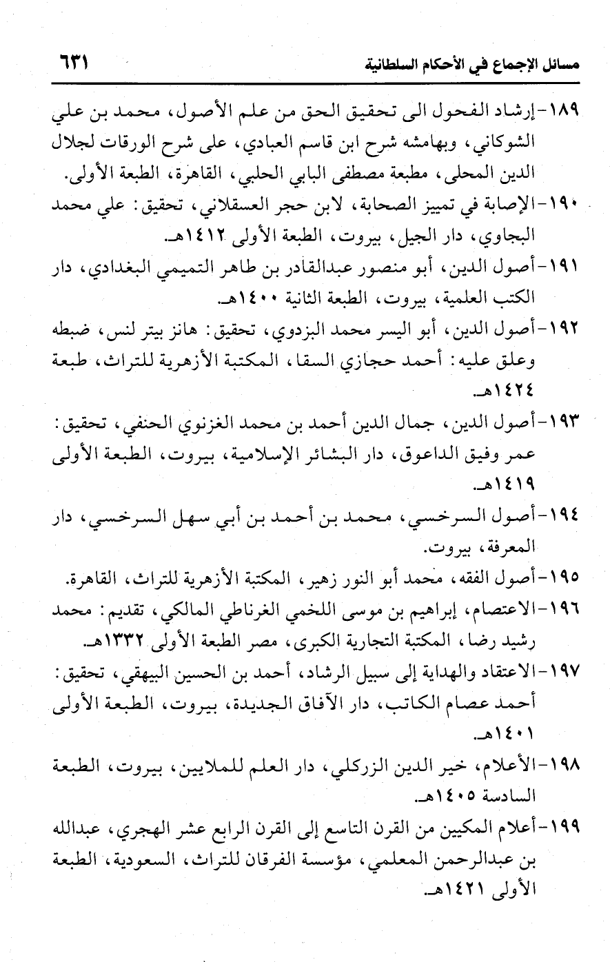189 - إرشاد الفحول إلى تحقيق الحق من علم الأصول، محمد بن علي الشوكاني، وبهامشه شرح ابن قاسم العبادي، على شرح الورقات لجلال الدين المحلى، مطبعة مصطفى البابي الحلبي، القاهرة، الطبعة الأولى.