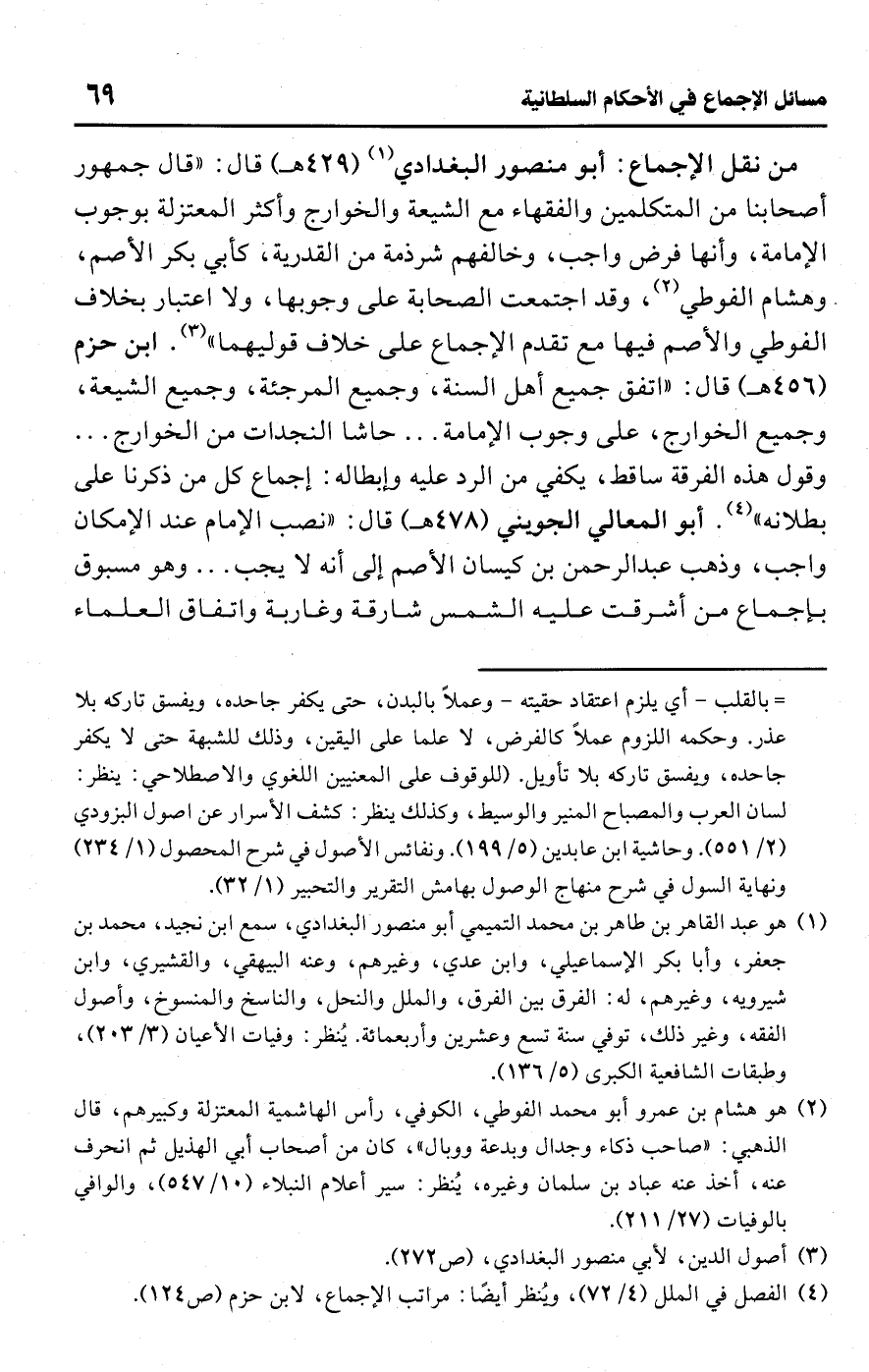 • من نقل الإجماع: أبو منصور البغدادي (¬1) (429 هـ) قال: "قال جمهور أصحابنا من المتكلمين والفقهاء مع الشيعة والخوارج وأكثر المعتزلة بوجوب الإمامة، وأنها فرض واجب، وخالفهم شرذمة من القدرية، كأبي بكر الأصم، وهشام الفوطي (¬2)، وقد اجتمعت الصحابة على وجوبها، ولا اعتبار بخلاف الفوطي والأصم فيها مع تقدم الإجماع على خلاف قوليهما" (¬3). ابن حزم (456 هـ) قال: "اتفق جميع أهل السنة، وجميع المرجئة، وجميع الشيعة، وجميع الخوارج، على وجوب الإمامة. . . حاشا النجدات من الخوارج. . . وقول هذه الفرقة ساقط، يكفي من الرد عليه وإبطاله: إجماع كل من ذكرنا على بطلانه" (¬4). أبو المعالي الجويني (478 هـ) قال: "نصب الإمام عند الإمكان واجب، وذهب عبد الرحمن بن كيسان الأصم إلى أنه لا يجب. . . وهو مسبوق بإجماع من أشرقت عليه الشمس شارقة وغاربة واتفاق العلماء