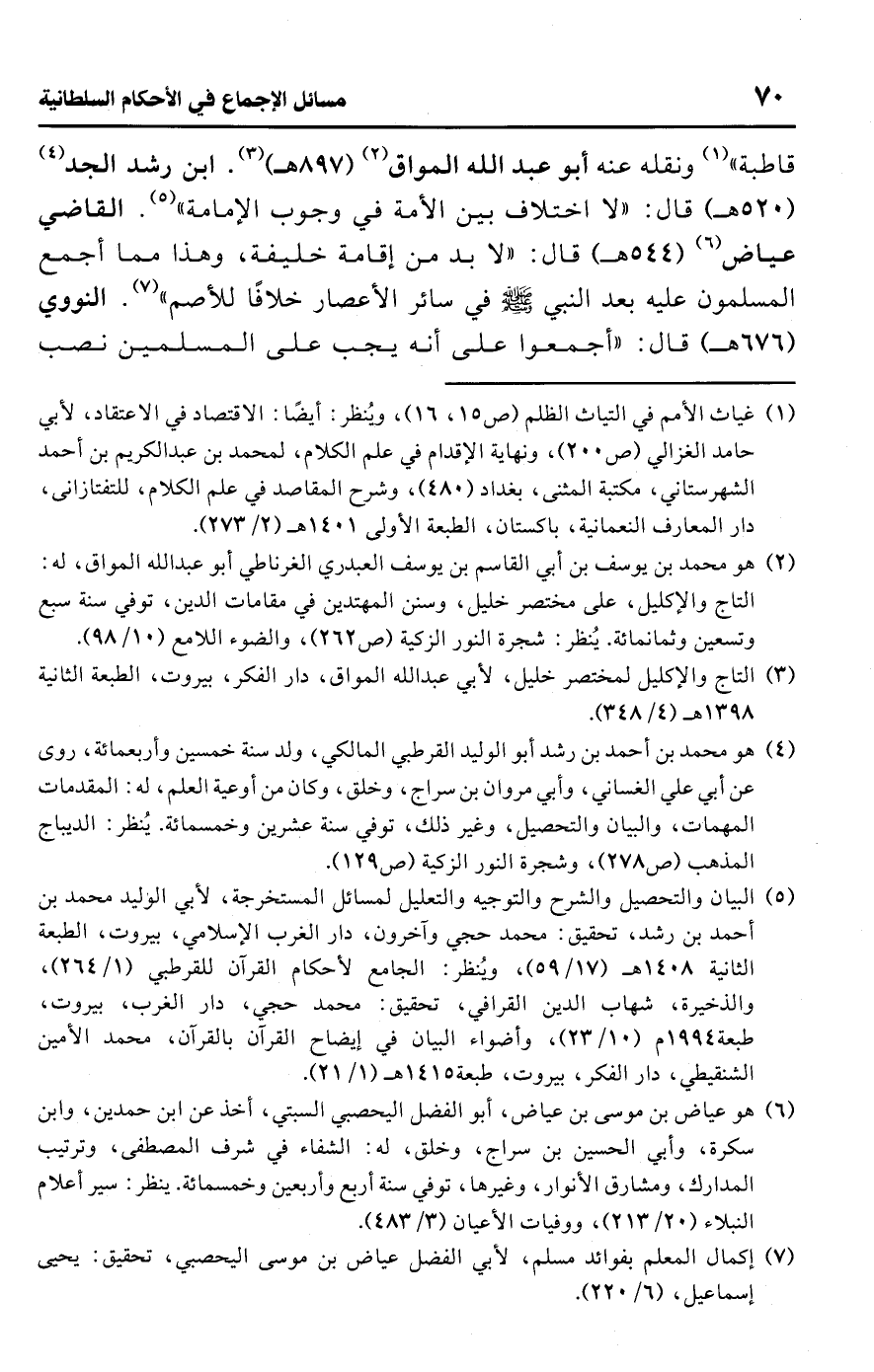 (¬1) غياث الأمم في التياث الظلم (ص 15، 16)، ويُنظر: أيضًا: الاقتصاد في الاعتقاد، لأبي حامد الغزالي (ص 200)، ونهاية الإقدام في علم الكلام، لمحمد بن عبد الكريم بن أحمد الشهرستاني، مكتبة المثنى، بغداد (485)، وشرح المقاصد في علم الكلام، للتفتازانى، دار المعارف النعمانية، باكستان، الطبعة الأولى 1401 هـ (2/ 273).