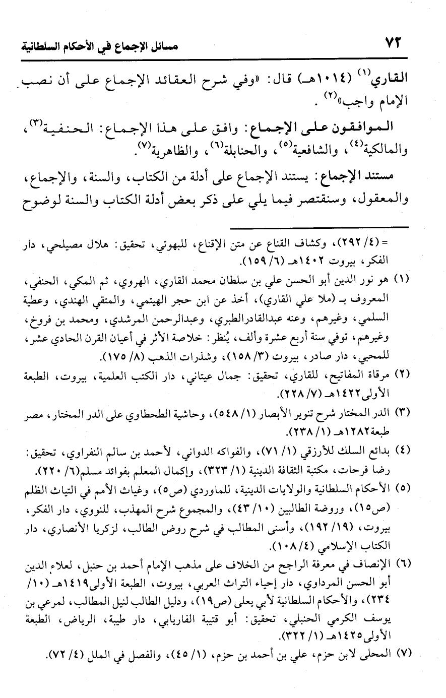 (¬6) الإنصاف في معرفة الراجح من الخلاف على مذهب الإمام أحمد بن حنبل، لعلاء الدين أبو الحسن المرداوي، دار إحياء التراث العربي، بيروت، الطبعة الأولى 1419 هـ (10/ 234)، والأحكام السلطانية لأبي يعلى (ص 19)، ودليل الطالب لنيل المطالب، لمرعي بن يوسف الكرمي الحنبلي، تحقيق: أبو قتيبة الفاريابى، دار طيبة، الرياض، الطبعة الأولى 1425 هـ (1/ 322).