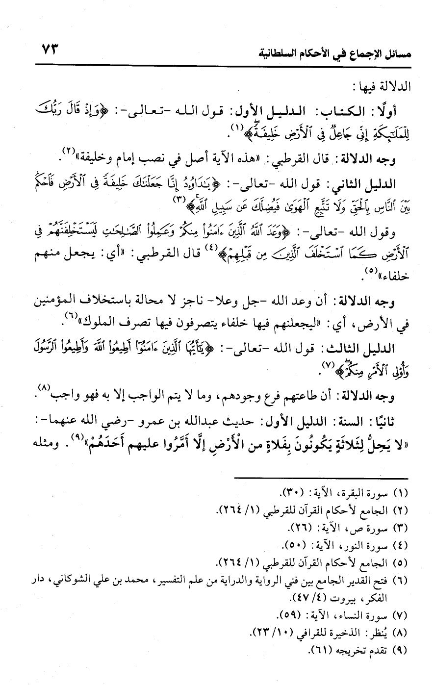 • أولًا: الكتاب: الدليل الأول: قول اللَّه -تعالى-: {وَإِذْ قَالَ رَبُّكَ لِلْمَلَائِكَةِ إِنِّي جَاعِلٌ فِي الْأَرْضِ خَلِيفَةً} (¬1).