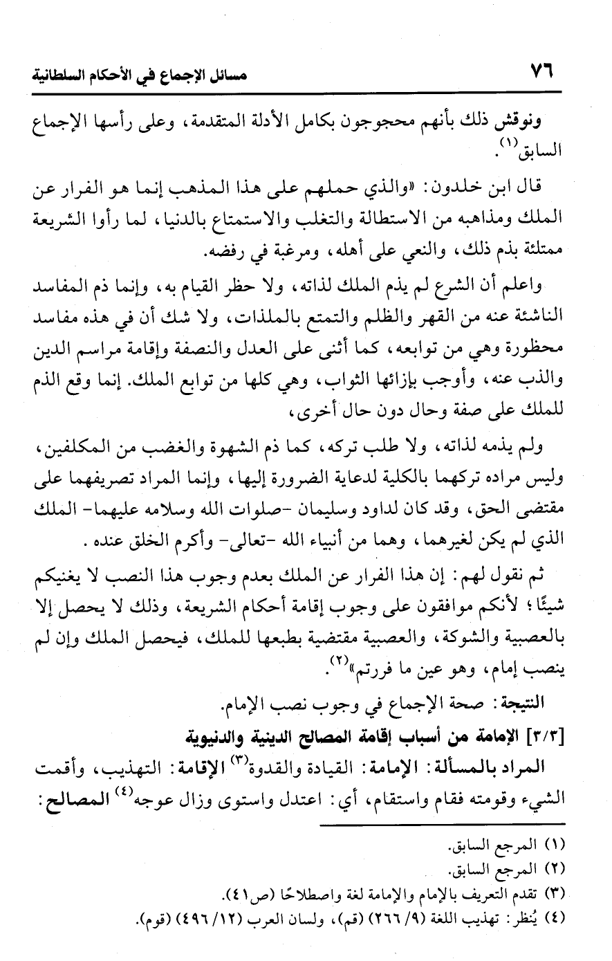 • المراد بالمسألة: الإمامة: القيادة والقدوة (¬3) الإقامة: التهذيب، وأقمت الشيء وقومته فقام واستقام، أي: اعتدل واستوى وزال عوجه (¬4) المصالح: