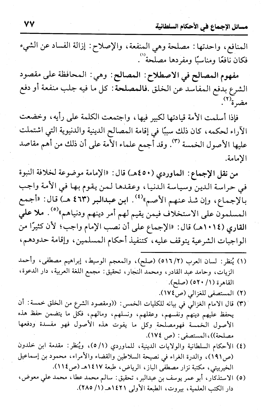 (¬4) الأحكام السلطانية والولايات الدينية، للماوردي (1/ 5)، ويُنظر: مقدمة ابن خلدون (ص 191)، والدرة الغراء في نصيحة السلاطين والقضاء والأمراء، محمود بن إسماعيل الخيربيتي، مكتبة نزار مصطفى الباز، الرياض، طبعة 1417 هـ (ص 114).