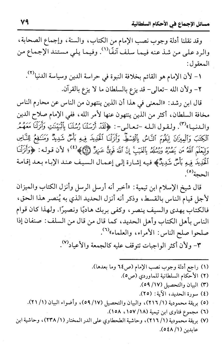 قال ابن رشد: "المعنى في هذا أن الذين ينتهون من الناس عن محارم الناس مخافة السلطان، أكثر من الذين ينتهون عنها لأمر اللَّه، ففي الإمام صلاح الدين والدنيا" (¬3). ولقول اللَّه -تعالى-: {لَقَدْ أَرْسَلْنَا رُسُلَنَا بِالْبَيِّنَاتِ وَأَنْزَلْنَا مَعَهُمُ الْكِتَابَ وَالْمِيزَانَ لِيَقُومَ النَّاسُ بِالْقِسْطِ وَأَنْزَلْنَا الْحَدِيدَ فِيهِ بَأْسٌ شَدِيدٌ وَمَنَافِعُ لِلنَّاسِ وَلِيَعْلَمَ اللَّهُ مَنْ يَنْصُرُهُ وَرُسُلَهُ بِالْغَيْبِ إِنَّ اللَّهَ قَوِيٌّ عَزِيزٌ (25)} (¬4)، لأن قوله: {وَأَنْزَلْنَا الْحَدِيدَ فِيهِ بَأْسٌ شَدِيدٌ} فيه إشارة إلى إعمال السيف عند الإباء بعد إقامة الحجة (¬5).
