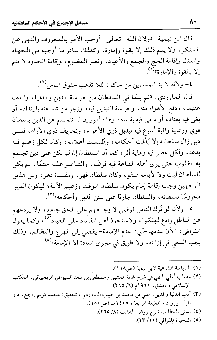 قال الماوردي: "ثم لِمَا في السلطان من حراسة الدين والدنيا، والذب عنهما، ودفع الأهواء منه، وحراسة التبديل فيه، وزجر من شذ عنه بارتداد، أو بغى فيه بعناد، أو سعى فيه بفساد، وهذه أمور إن لم تنحسم عن الدين بسلطان قوي ورعاية وافية أسرع فيه تبديل ذوي الأهواء، وتحريف ذوي الآراء، فليس في بن زال سلطانه إلا بُدِّلت أحكامه، وطُمست أعلامه، وكان لكل زعيم فيه بدعة، ولكل عصر فيه وهاية أثر، كما أن السلطان إن لم يكن على دين تجتمع به القلوب حتى يرى أهله الطاعة فيه فرضًا، والتناصر عليه حتمًا، لم يكن للسلطان لبث ولا لأيامه صفو، وكان سلطان قهر، ومفسدة دهر، ومن هذين الوجهين وجب إقامة إمام يكون سلطان الوقت وزعيم الأمة؛ ليكون الدين محروسًا بسلطانه، والسلطان جاريًا على سنن الدين وأحكامه" (¬3).