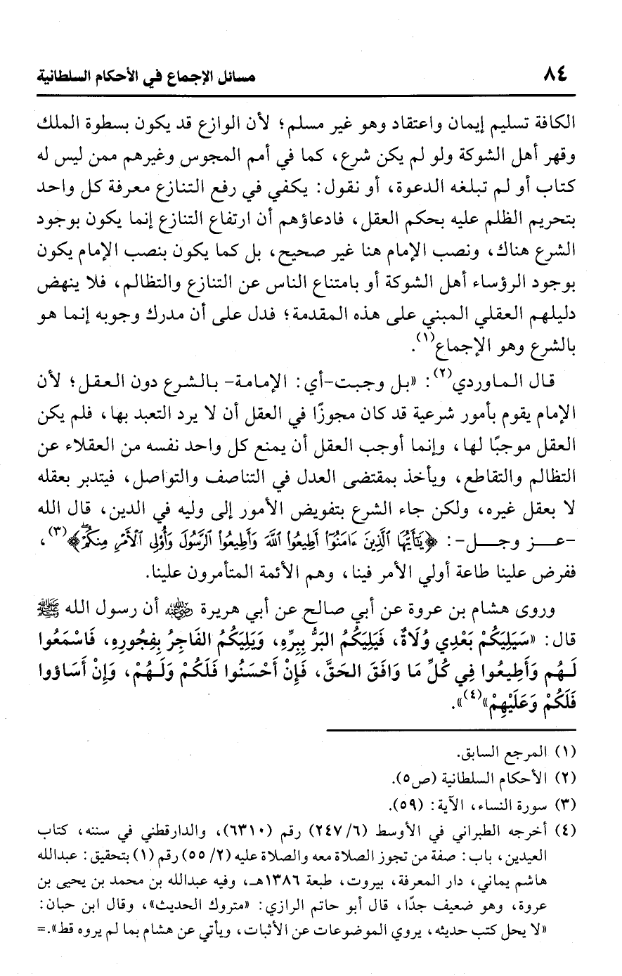 قال الماوردي (¬2): "بل وجبت -أي: الإمامة- بالشرع دون العقل؛ لأن الإمام يقوم بأمور شرعية قد كان مجوزًا في العقل أن لا يرد التعبد بها، فلم يكن العقل موجبًا لها، وإنما أوجب العقل أن يمنع كل واحد نفسه من العقلاء عن التظالم والتقاطع، ويأخذ بمقتضى العدل في التناصف والتواصل، فيتدبر بعقله لا بعقل غيره، ولكن جاء الشرع بتفويض الأمور إلى وليه في الدين، قال اللَّه - عَزَّ وَجَلَّ -: {يَاأَيُّهَا الَّذِينَ آمَنُوا أَطِيعُوا اللَّهَ وَأَطِيعُوا الرَّسُولَ وَأُولِي الْأَمْرِ مِنْكُمْ} (¬3)، ففرض علينا طاعة أولي الأمر فينا، وهم الأئمة المتأمرون علينا.