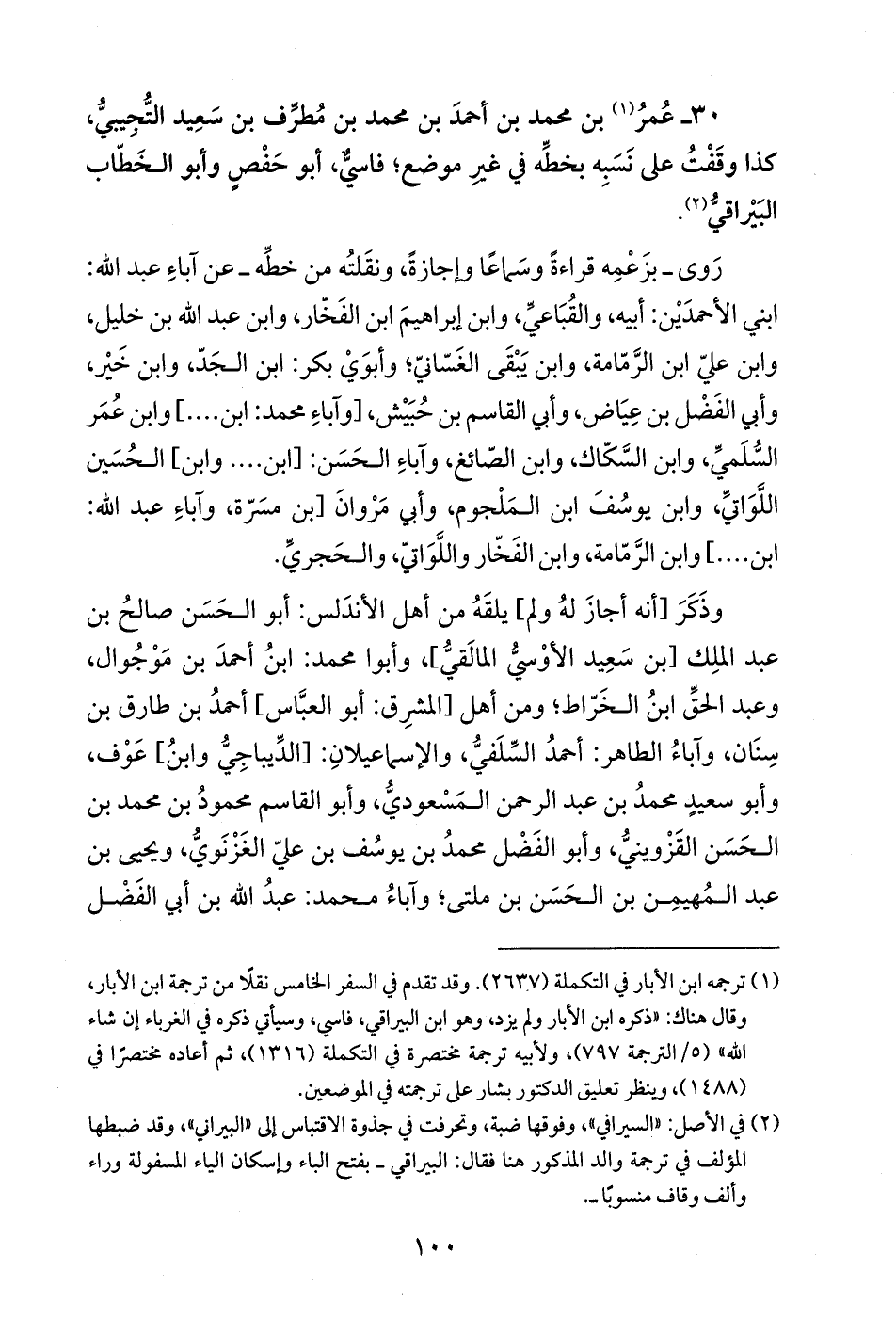 (¬1) ترجمه ابن الأبار في التكملة (263.7). وقد تقدم في السفر الخامس نقلًا من ترجمة ابن الأبار، وقال هناك: "ذكره ابن الأبار ولم يزد، وهو ابن البيراقي، فاسي، وسيأتي ذكره في الغرباء إن شاء الله" (5/الترجمة 797)، ولأبيه ترجمة مختصرة في التكملة (1316)، ثم أعاده مختصرًا في (1488)، وينظر تعليق الدكتور بشار على ترجمته في الموضعين.