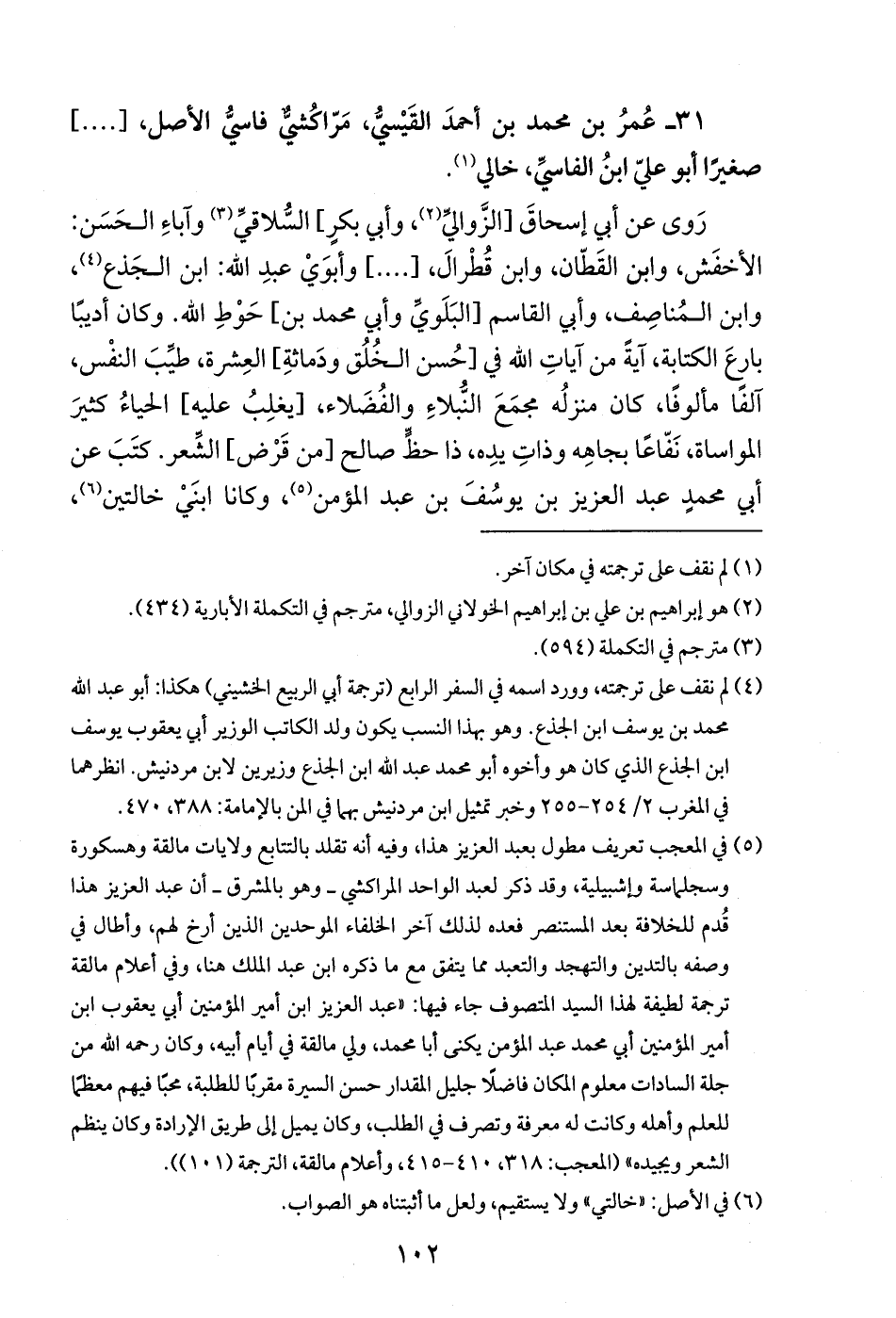 31 - عُمرُ بن محمد بن أحمدَ القَيْسيُّ، مَرّاكُشيٌّ فاسيُّ الأصل، [......] صغيراً أبو عليّ ابنُ الفاسيِّ، خالي (¬1).