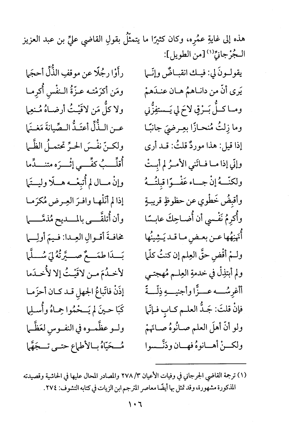(¬1) ترجمة القاضي الجرجاني في وفيات الأعيان 3/ 278 والمصادر المحال عليها في الحاشية وقصيدته المذكورة مشهورة، وقد تمثل بها أيضًا معاصر المترجم ابن الزيات في كتابه التشوف: 274.